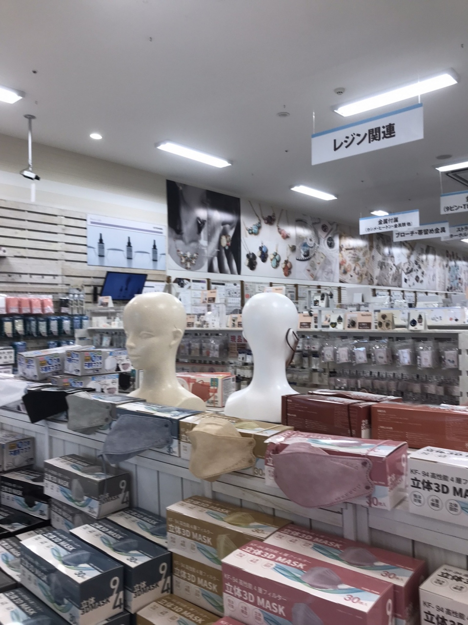 久しぶりにキューズモールに来て、やはり一番に寄りたいと思うのは、こちらのお店です。色々なプリント生地があって、見ているだけで楽しいです。パッチワーク生地まで種類が豊富なのは、さすがに手芸の専門店ですね。時節柄、マスクもあまり見たことがない種類が置いてましたね。