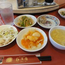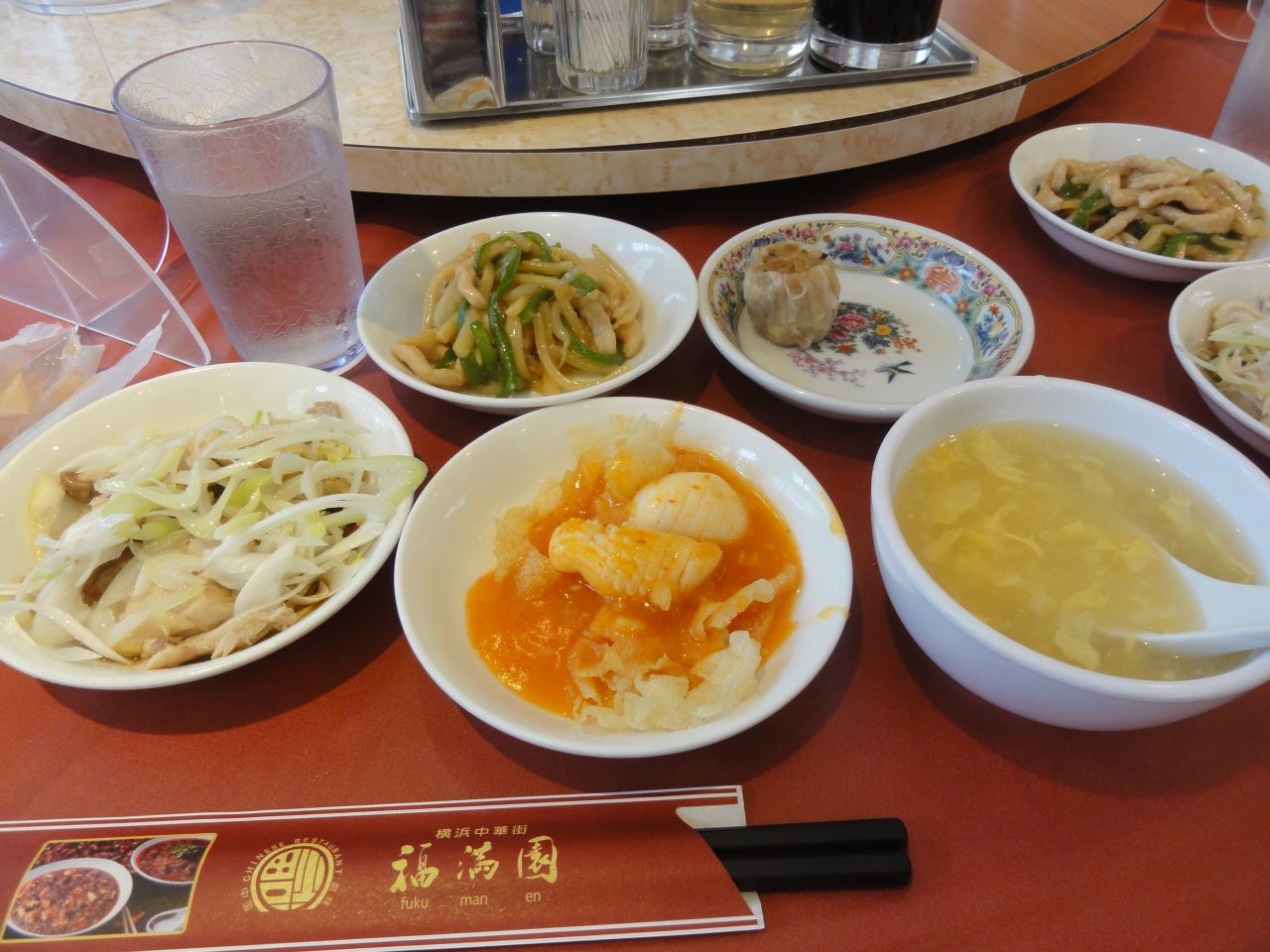 開港道に面したお店をツアーのランチで利用。追加料金なしの中華満喫コースメニューは蒸し鶏の特性ねぎ塩ダレ、豚肉の細切と季節野菜の炒め物、イカのチリソース煮、ポークシューマイ、五目チャーハン、コーンスープ、杏仁豆腐で、味付けはあっさり淡白でした。