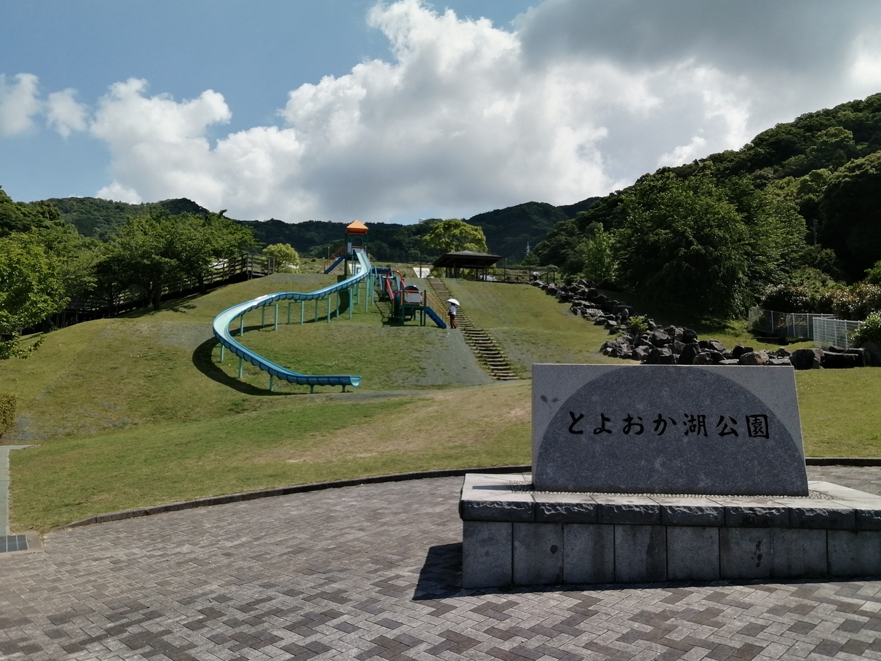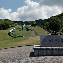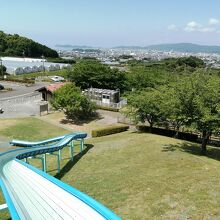 山の麓にあり、公園背後のダムがとても存在感があります。公園の目玉は斜面を利用した長いすべり台。これは絶対に子供が喜ぶやつです。すべり台の上部からは眺めがよく、三河湾と竹島がチラ見できます。