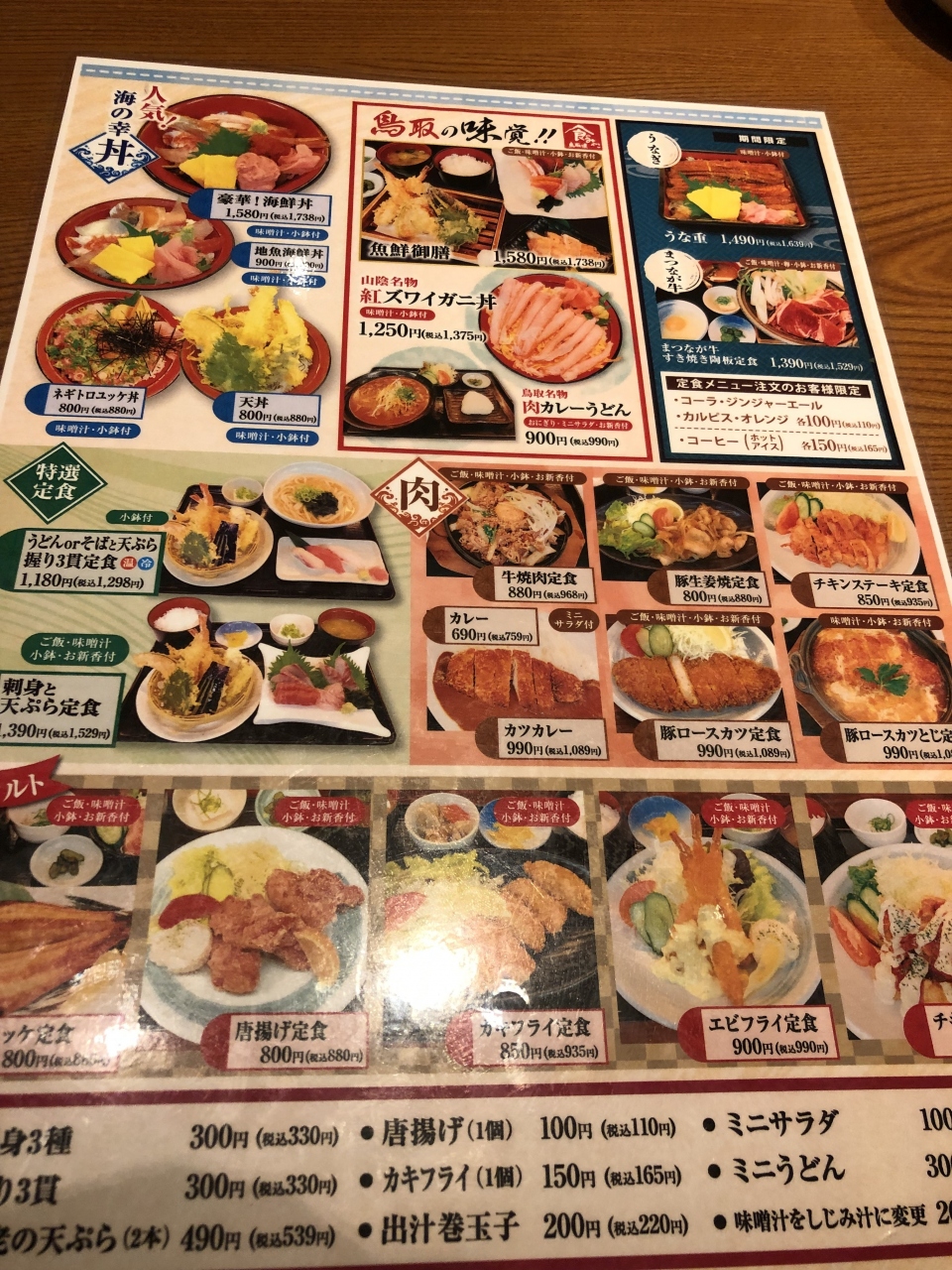 車を使って、余部鉄橋、湯村温泉、鳥取砂丘観光を終えて、鳥取駅に着いたのは午後3時近くになっていました。その間、食事らいいものは食べていなかったので、鳥取駅構内にあるこの店で遅めの昼食になりました。夕食のことを考えて軽く食べておこうというだけでした。全国チェーンの居酒屋さんで、過去に一度大阪の方で食事をしたことがあり、美味しかったので安心して入れました。時間が食事時間に重なっていなかったので、お客さんが少ないです。居酒屋さんらしい元気な店員さんに迎えられて、さっそく半個室の席に案内されました。メニューを確認。あまりボリュームのないものにするつもりだったので、「地魚海鮮丼(すし飯を選択)」と「海鮮ユッケ丼」を二人で注文しました。他のお客さんは、昼飲みして楽しそうでしたが、まだ車の運転があるので我慢。しばらくすると注文品が出てきて、さっそくいただき始めます。店頭に「山陰の漁港直送」と書いてあるとおり、魚は新鮮です。このお店は鳥取駅構内にあり、昼も営業されているので使い勝手は良さそうです。また価格もリーズナブルでした。