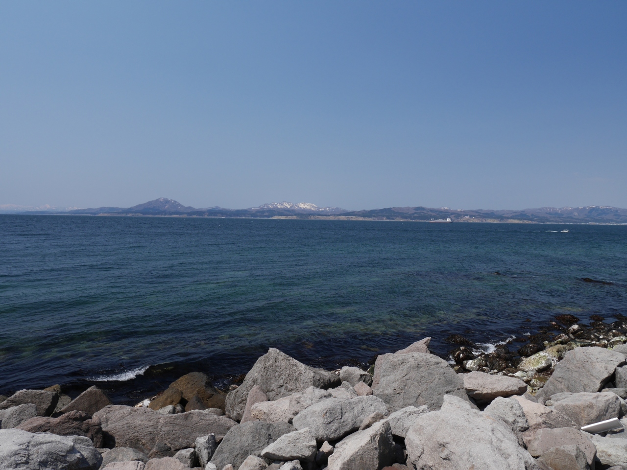 「函館市入舟町前浜海水浴場」は、函館の西海岸沿いの道を南下できるところまで進んだところにあります。私たちは4月末に訪れたので、もちろん海水浴客の姿はなく、ほぼ無人状態でした。砂浜ではなく岩場になっており、夏場は磯遊びも楽しめるようです。