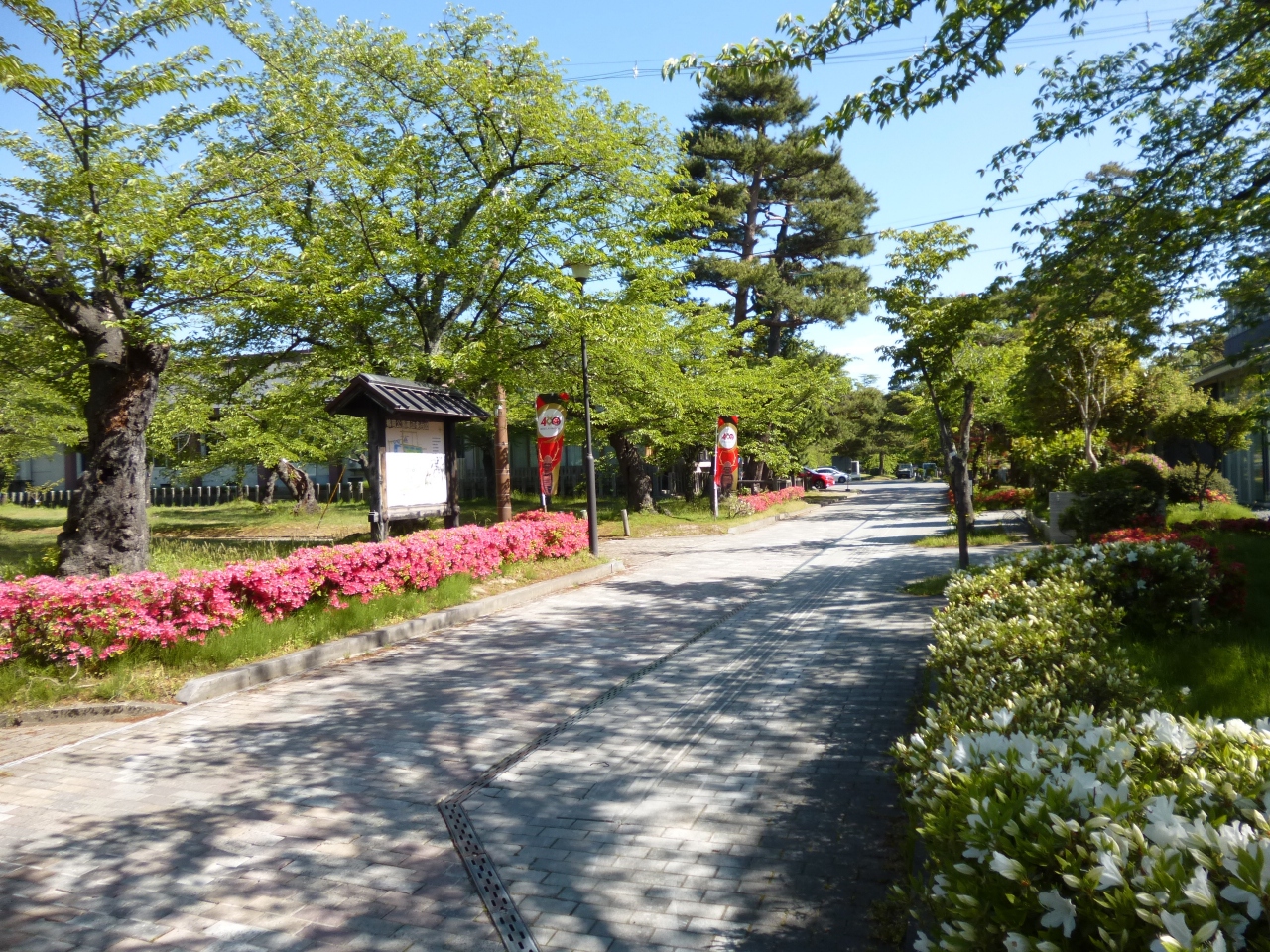 鶴岡市の中心地に鶴岡公園があります。庄内藩酒井家の居城であった鶴ケ岡城があった場所です。幕末、会津藩と共に強硬派として官軍と戦った庄内藩は廃藩置県で取り潰し、城も取り壊され城内の建築物は全て破却され鶴岡公園となったそうです。そのため園内には、お城の後を感じるものは案内の立札のみです。庄名神社は本丸跡に建てられているそうです。現在は、公園内や周辺にも訪ねたいところが多く、観光の中心にもなっています。