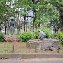 淀橋浄水場だった場所に昭和43年、都立公園(その後新宿区に移管)として開園された新宿中央公園内にあります。この像は太田道灌と紅皿の逸話で、狩りに出かけた道灌は途中大雨に合い、蓑を貸してほしいと農家を訪ねたところ、農家の若い娘紅皿は一輪のヤマブキの花を差し出します(七重八重花は咲けども山吹の 蓑(実の)ひとつだに亡きぞ悲しき)。娘の行動に怒った道灌はその場を立ち去ります。後に道灌の部下から説明を受け、自分の和歌の知識不足を恥、精進し、文武両道の侍になったというエピソードです。