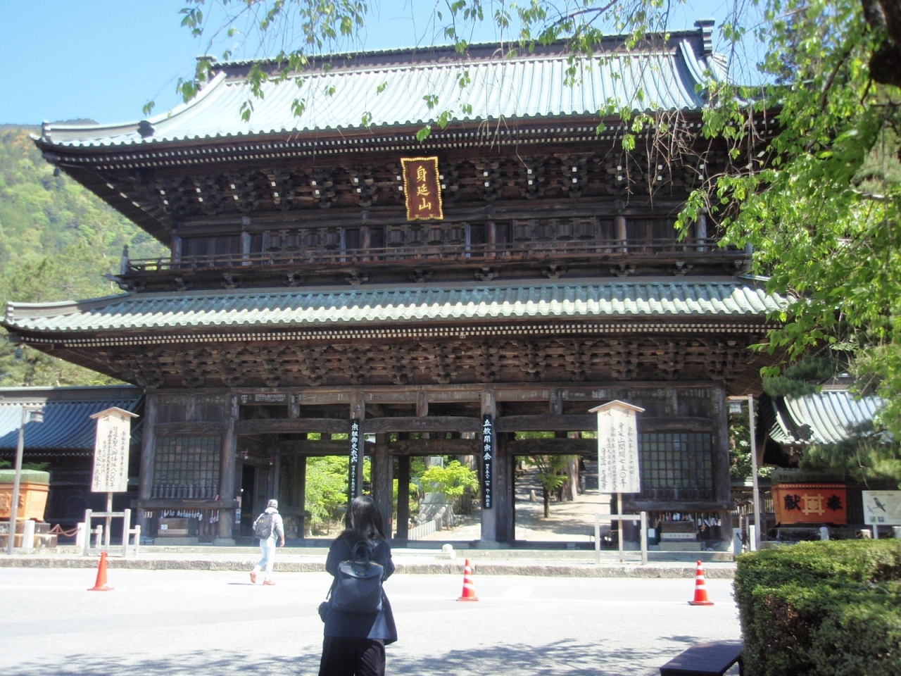 1281年創建、開山は日蓮上人、日蓮宗の総本山、本尊は三宝尊です。伽藍は総門、大きくて立派な山門、菩提梯、本堂、祖師堂、五重塔、御廟、鐘楼、仏殿、拝殿、御真骨堂、奥之院思親閣、数十の塔頭等多く配されています。一日では見切れないほどの建物の多さで、且つ見るべきものも多く有します。また敷地も広く中腹から身延山山頂まで全域です。大本堂と奥之院の間はロープウエイで繋がっています(もちろん徒歩登山も可能です)。これだけの施設を維持管理、山林の維持管理をしていくには膨大な費用がかかるのでしょう。門徒330万人は凄い力を持っていると感心してしまいます。下から大本堂までの間、一段の高さが通常より高い、合計287段(標高差約100M)の石段があります。石段が苦手の方は男坂(かなり急)、女坂(それでも急)を利用できます。石段登りに挑戦しました。坂道も苦手の方は駐車場から斜行エレベーターが利用できます(寸志)。明治時代の大火で建造物は焼失したために、建屋は総じて新しく、古い建物はありません