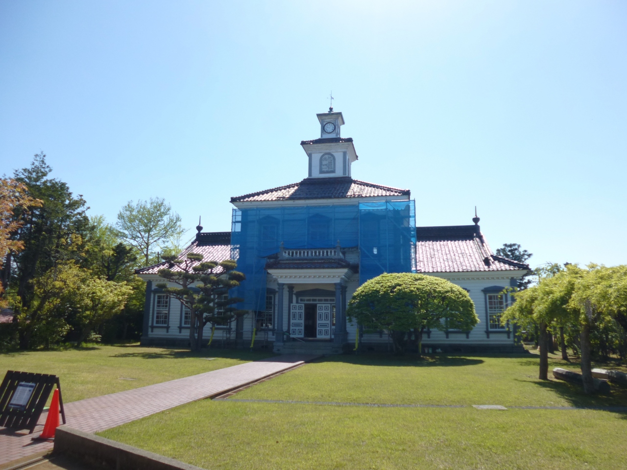 鶴岡公園の西側、致道博物館の中にある移築された建物です。明治9年、廃藩置県によって、置賜、山形、鶴岡の3県が統合、山形県が誕生。鶴岡は西田川郡となりこの建物が造られたようです。建物中央には塔屋・時計塔がある木造2階建、両翼1階建の印象的な建物です。現在耐震、修復工事中で足場がかかり、その全容と、内部が見られなかったのが残念でした。