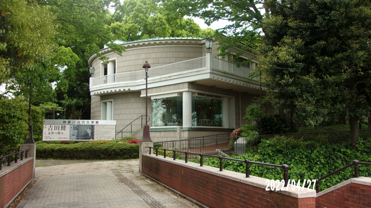 この県立神奈川近代文学館は港の見える丘公園の中で山手エリアで公園の南東の端にあります。近くには大佛次郎記念館があります2つをつなぐ霧笛橋も架けられています。その霧笛橋を渡りながらこの建物が見れます。昭和59年に開館しています。横浜にかかわる作家や児童文学や歌詞など多様で蔵書数もすごいのです。作家の作品展をはじめ講演会や朗読会など文学の啓発活動もおこなっています。雑誌も管理保管しています。