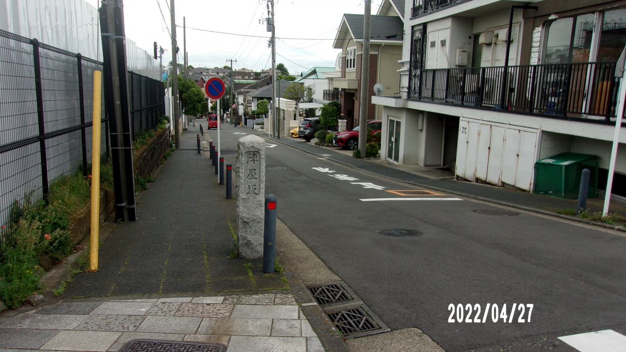 この陣屋坂は外国人墓地の山手通りから分離した坂です。みなとみらい線元町・中華街駅から南東に15分程度の場所にあります。この坂の名称はこの辺りで明治初めにイギリス人居住者の保護のためにイギリス軍が駐屯し陣営を構えていたからと言われています。その遺構はありません。急な坂です。坂の両側は住宅地です。