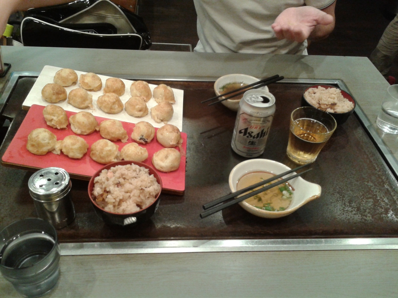 魚の棚の一番端っこ(西側)にあるお店。店の前にタコを吊っているのが目立ちます。衛生的なことが気になる方は抵抗あるかもしれません。タコ飯セットにしましたがお腹いっぱいになり過ぎました。明石焼きだけでよかった。明石焼き自体はよく行く別の店の方が好みでした。