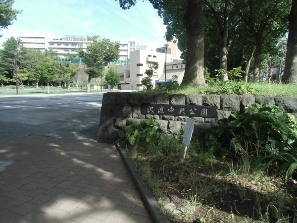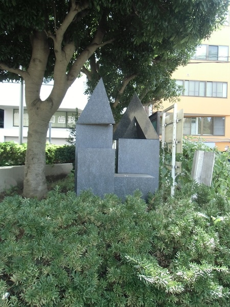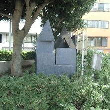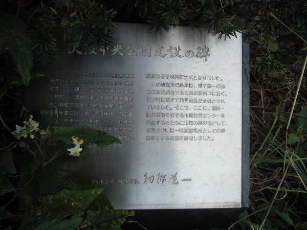 そのセンター近くの植え込みの中に、積み木を重ねたようなオブジェがありますが、こちらは「沢渡中央公園建設の碑」。