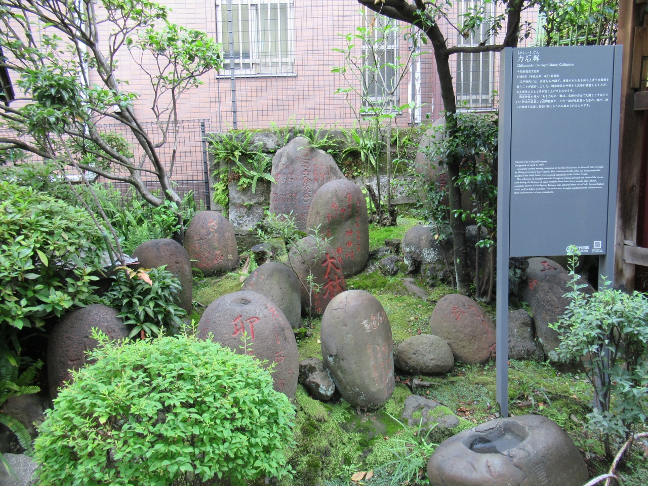 JR秋葉原駅中央南口から3分ほど、神田ふれあい橋を渡った左手に建つ柳森神社の境内に13個の力石が保存されています。江戸時代の娯楽の一つで、若者が力試しに使用した石です。保存されている力石は、当時、大関として名をはせた神田川徳蔵とその仲間が使用していたものだそうで、その業績を後世に伝えるために集められたとのことです。真っ赤な顔で石を持ち上げる人と、歓声を上げる見物人の姿が浮かんでくる力石です。