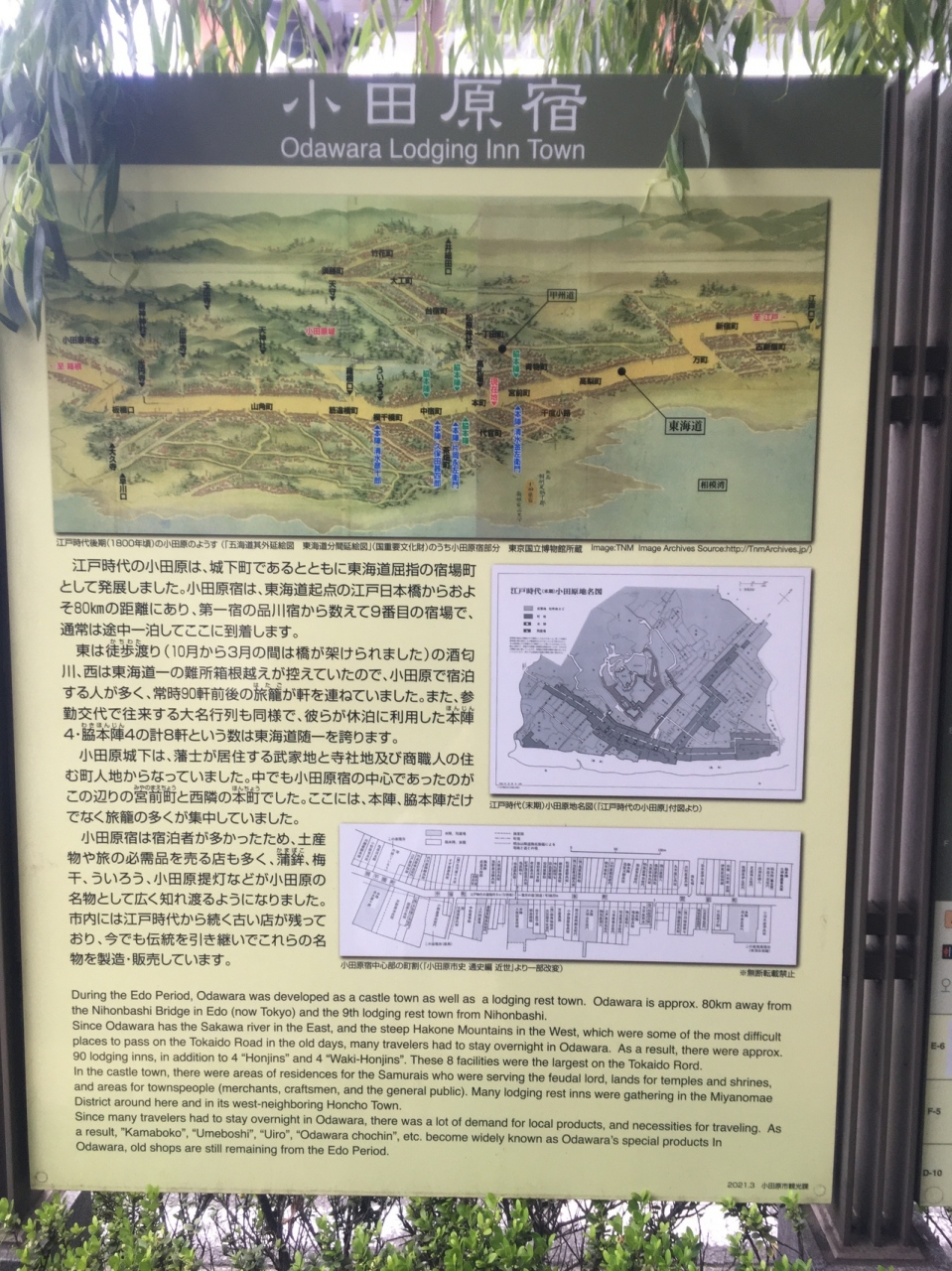 小田原は東海道五十三次の9番目の宿場で江戸を出て最初の城下町です。旧東海道には90軒ほどの旅籠があったと言われまが、今その面影はありません。小田原駅東口から徒歩で10 分ほどのところにある「小田原宿なりわい交流館」の家屋や「小田原かまぼこ通り」「清水金左衛門本陣跡」などにその雰囲気をかろうじて感じることが出来ます。
