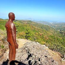 国東町の旧千燈寺跡に行った後、車で帰る途中に何やら階段…気になって登ってみることに…上り詰めるといい眺め。そして、岩肌の上に何やら銅像…国東半島アートプロジェクトというのがあり、設置されたようです。なんとも奇妙な感じですが引き込まれてしまいました。