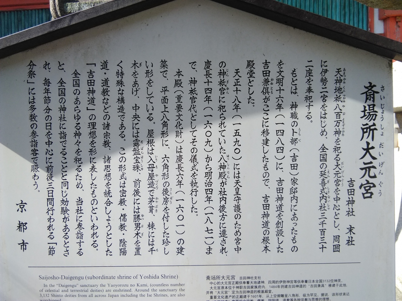 吉田神社は、左京区吉田神楽岡町の吉田山に鎮座しています。藤原氏由来の伝統ある神社です。節分の行事はこの神社が発祥らしいです。広い境内にはたくさんの摂社が祀られていて、本殿以外はかなりの階段や上り坂道が多いです。小高い場所に斎場所大元宮という神社がありました。斎場所大元宮は、平面八角形、屋根を入母屋造萱葺、背後に平面六角形の後房を付す特異な形式の社殿でした。広い境内は観光客も少なく、閑散としていたのでゆっくりと見学することができました。ほぼ貸し切り状態で写真が撮れたのは行った甲斐がありました。