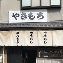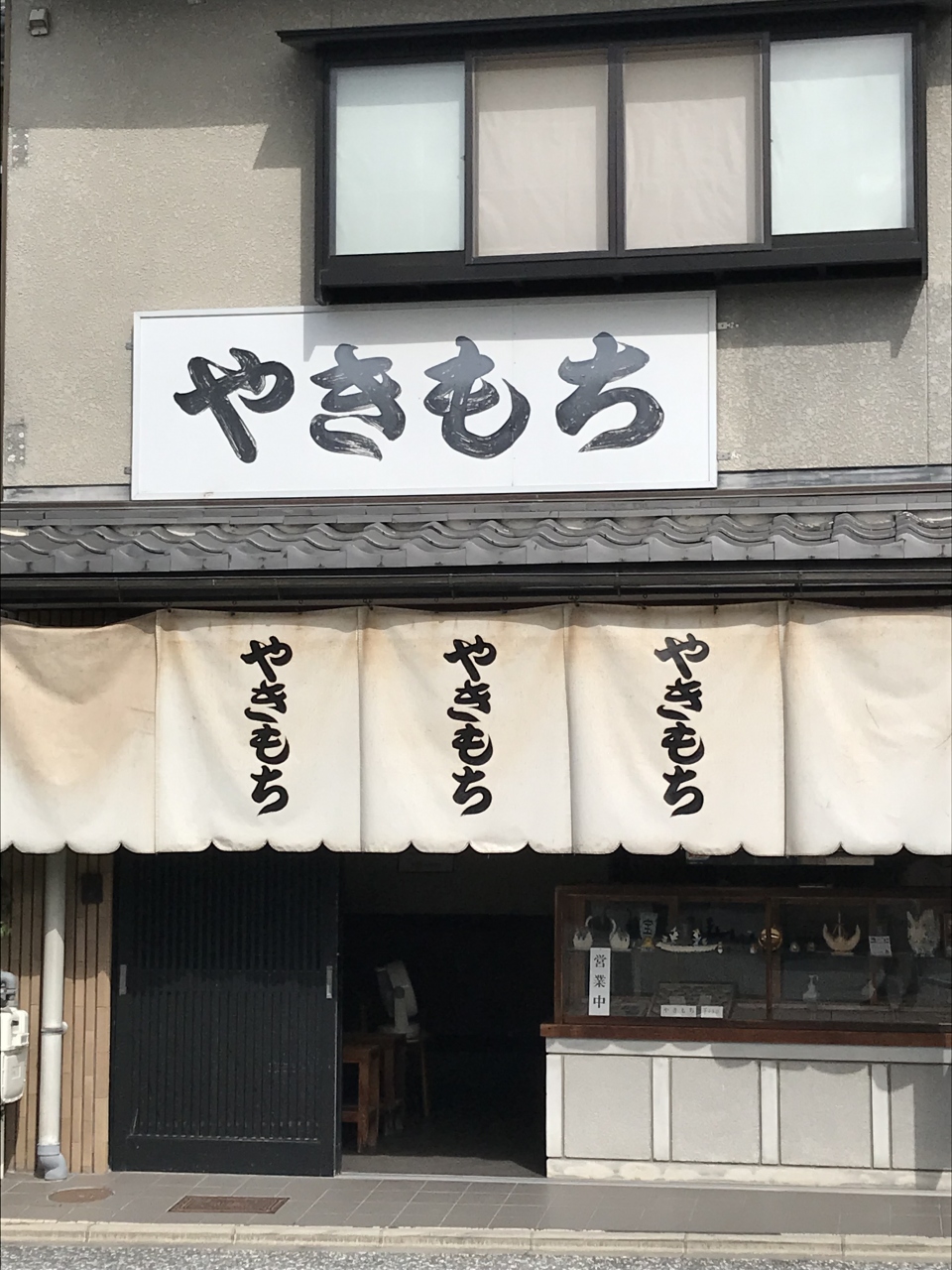 北野天満宮東門を出るとすぐ「やきもち」の大きな看板