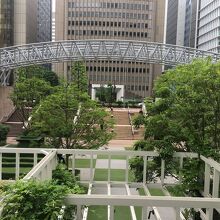 ビルに挟まれた場所にあり、地上に出ていますが吹き抜けとなっているため、地下1階にあります。人工の芝が引いてあり緑が目立ち、椅子やベンチも程よく置いてあるため、昼時は弁当を食べている人が多かったです。地下鉄駅に繋がっています。