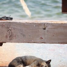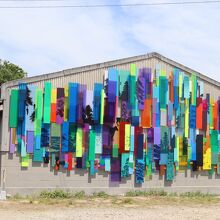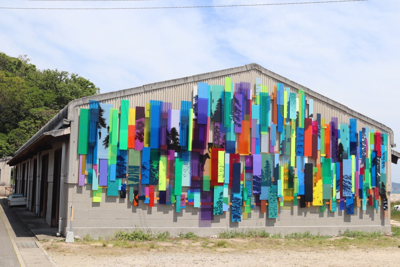 男木島のはずれにある漁港、倉庫の壁面にはさまざまな色に塗られたアクリル板が貼られた屋外アートです。午後の陽の光にきらきら輝きます。周辺はたくさんのネコたちがおり、のんびりヒルネするその姿に癒されました。