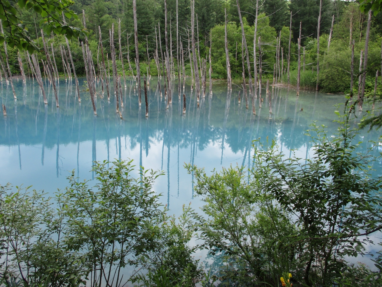 特典航空券で行く美瑛一人旅でございます。白金の青い池でございます。地元の人には申し訳ないですが、美瑛の夏は短いので、5月から9月まで頃に行くのがベターです。夏の美瑛で太陽の日を浴びながら、日に照らされた美しい池を眺めていました。