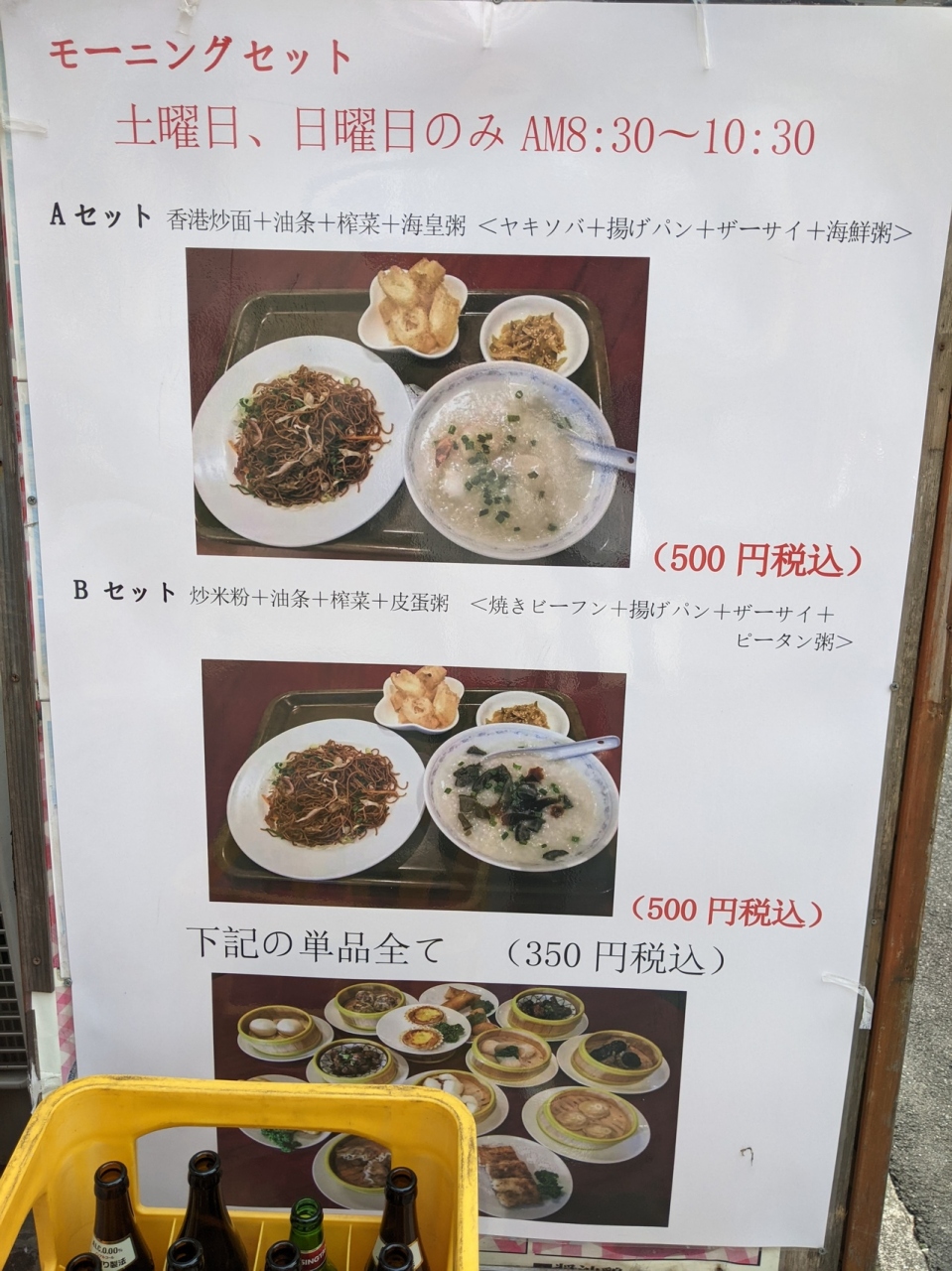 朝8時半から10時半までやっている500円(税込)のモーニングはA、Bのニ種類。単品で点心や粥も注文でき、私は鶏肉の粥(350円)を注文しました。以前は粥を単品注文するとザーサイが着いてたんですが無くなったのかな…良い塩加減でおいしかったので残念ですが朝からしっかり充電できました。