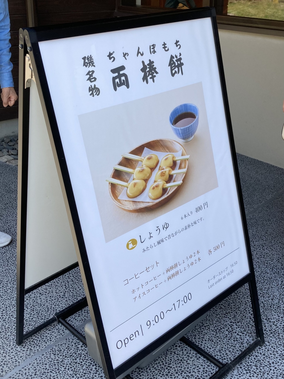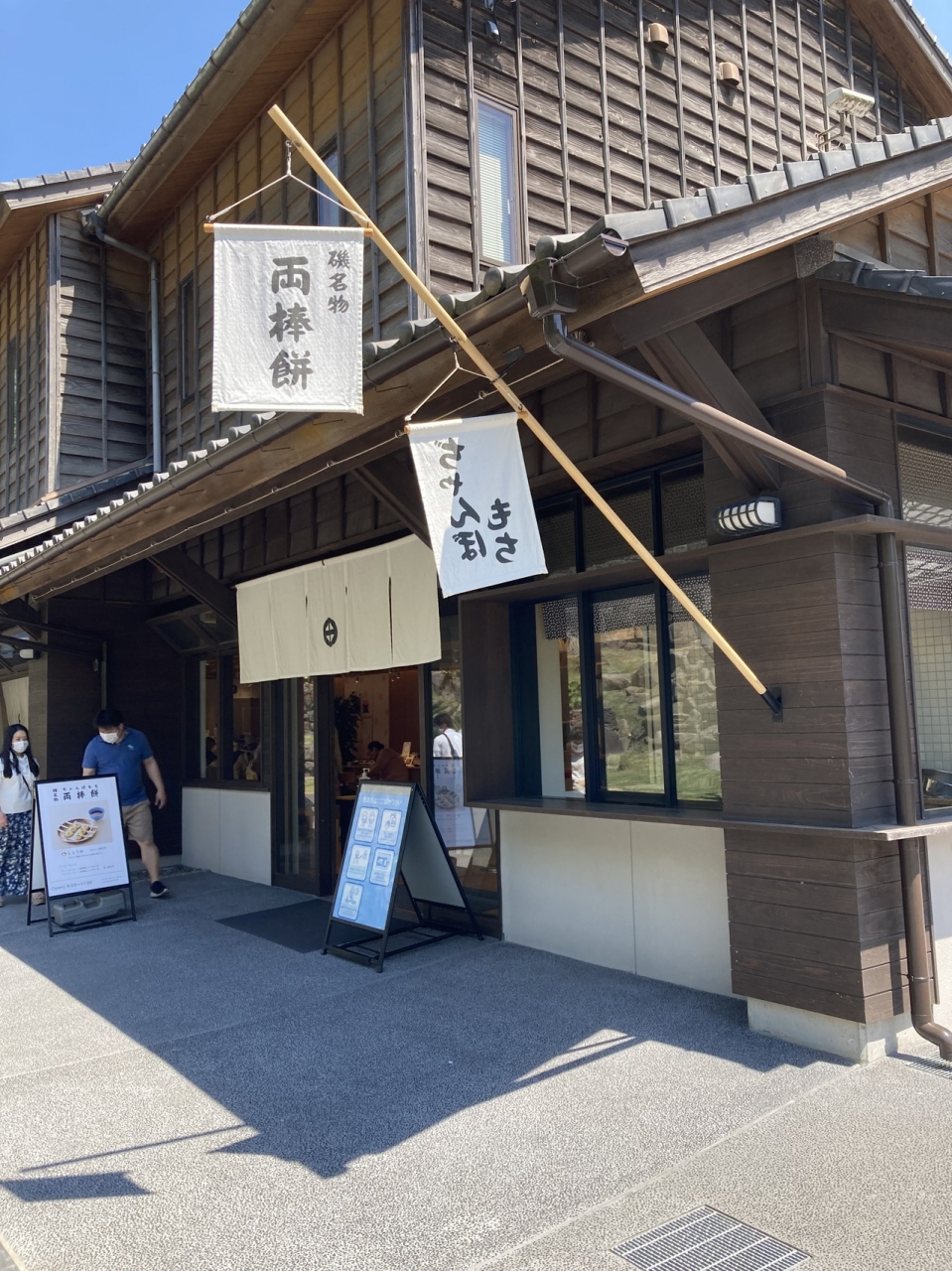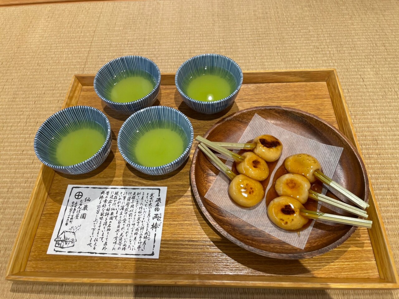 付近のお店で食べる予定にしていたがお腹はいっぱい、時間も押して庭園見学後こちらで一皿だけ買ってひと休み。人数分の冷たいお茶を淹れてくれた。両棒餅かわいい!店内お土産コーナーにゴザのベンチ、とてもきれいです。風が通って気持ち良く休憩できた。庭園の美観を乱さない外観もgoodです!