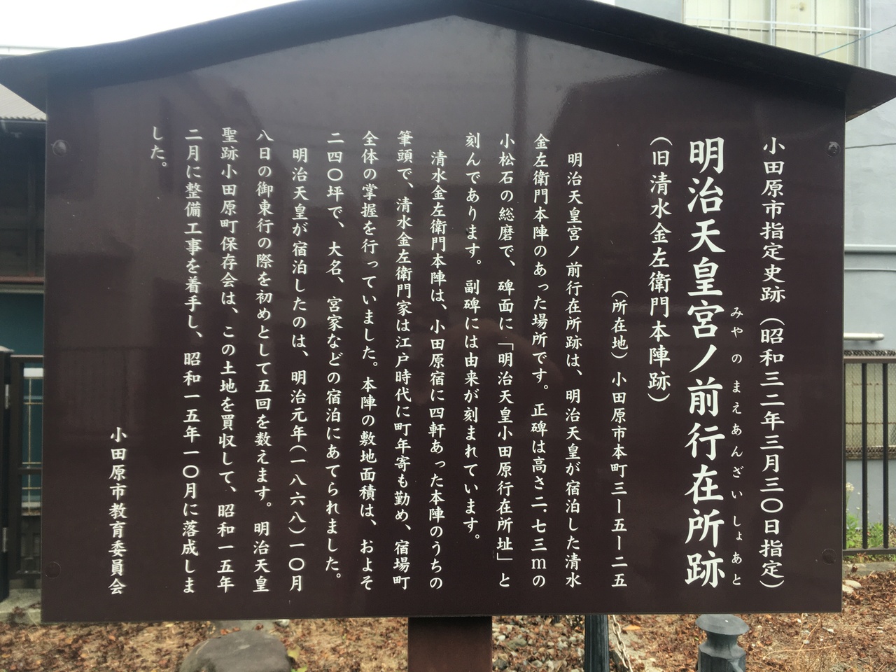 小田原駅東口から徒歩で15分ほどです。「小田原なりわい交流館」の東側にあります。「清水金左衛門本陣跡」は小田原宿に4軒あった本陣の筆頭で、明治元年から5回に渡り明治天皇はここに宿泊されたそうです。道から奥に入ると公園のような敷地に碑が立っています。揮毫は近衛文麿とあります。