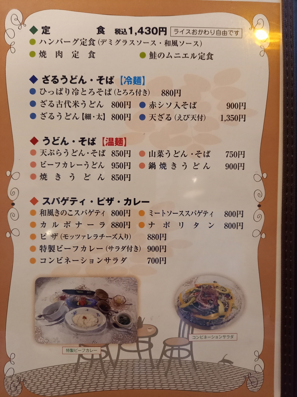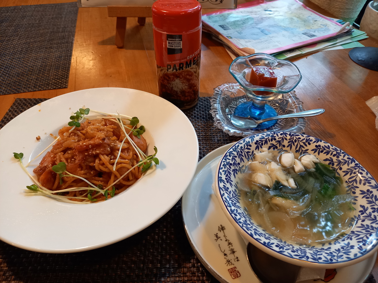 宮城県の栗原合同庁舎近くの旧国道4号線沿いにあります。定食は固定が3種類、週代わりが9種類で全て1430円です。麺類はうどん、そば、スパゲティなどが750円からあります。今回はナポリタン800円をいただきました。スープとちょっとしたデザートが付きます。麺は熱々、細め短めでした。ソースは甘めでした。量的にちょっと物足りなさを感じました。