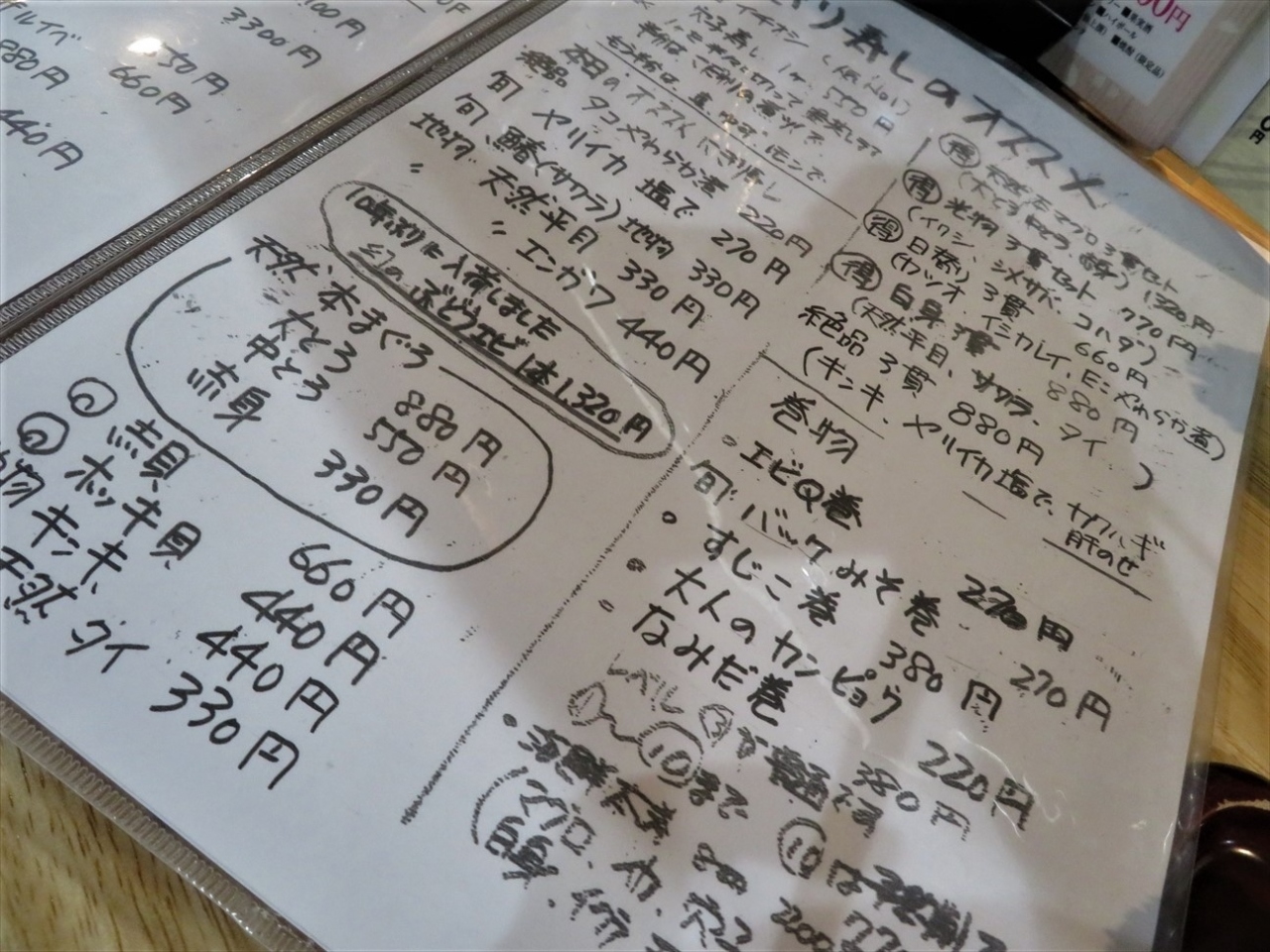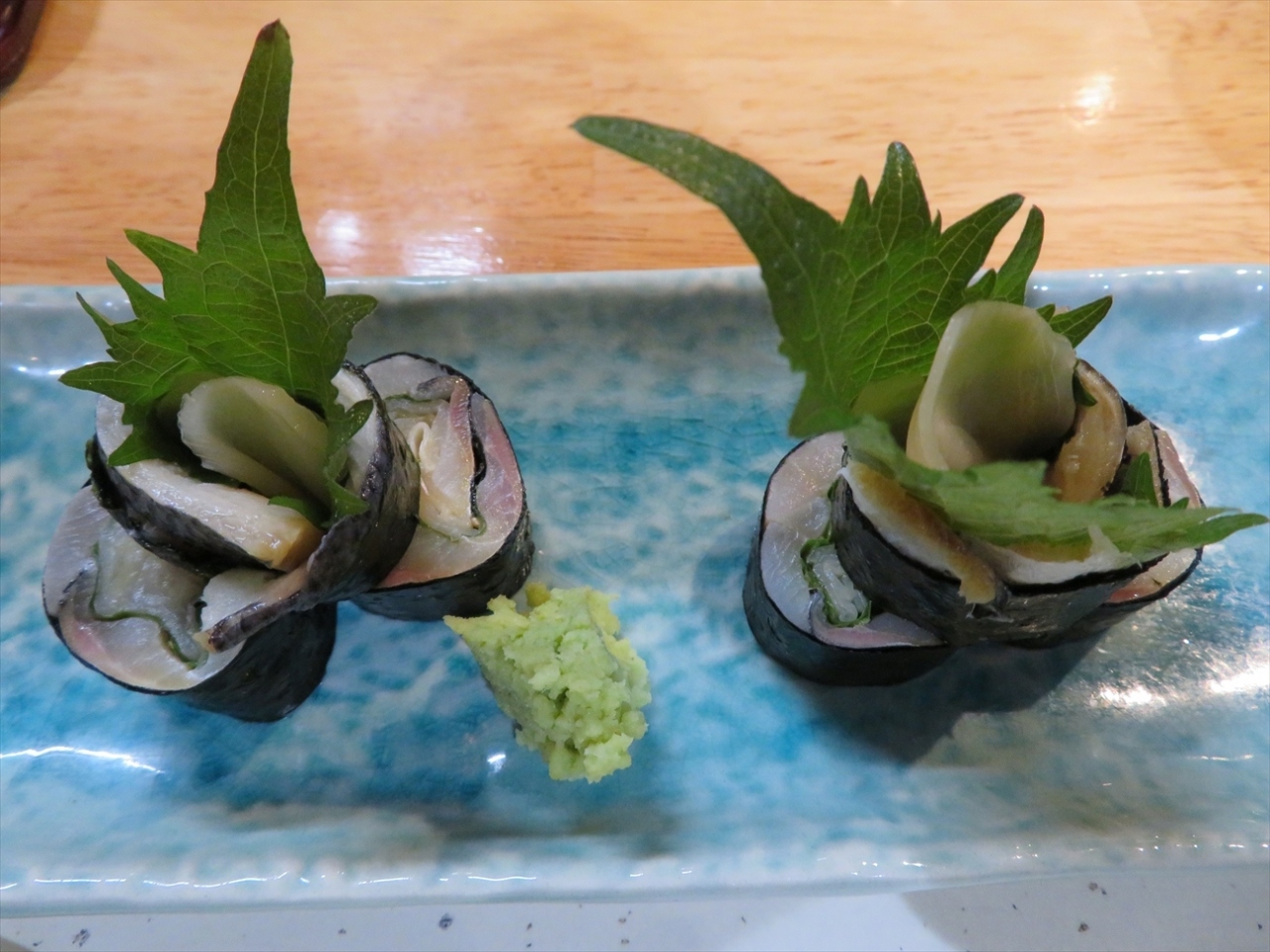お酒は全く飲めない体質の私ですが、おつまみ系の食べ物は大好きなので、あれこれ目移りしながら、小肌のガリ巻き、イワシの刺身のほか、奮発して特上にぎりを頼んでみました。