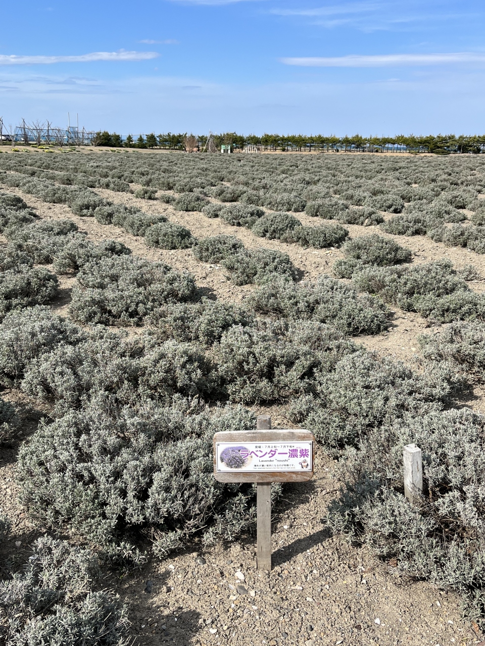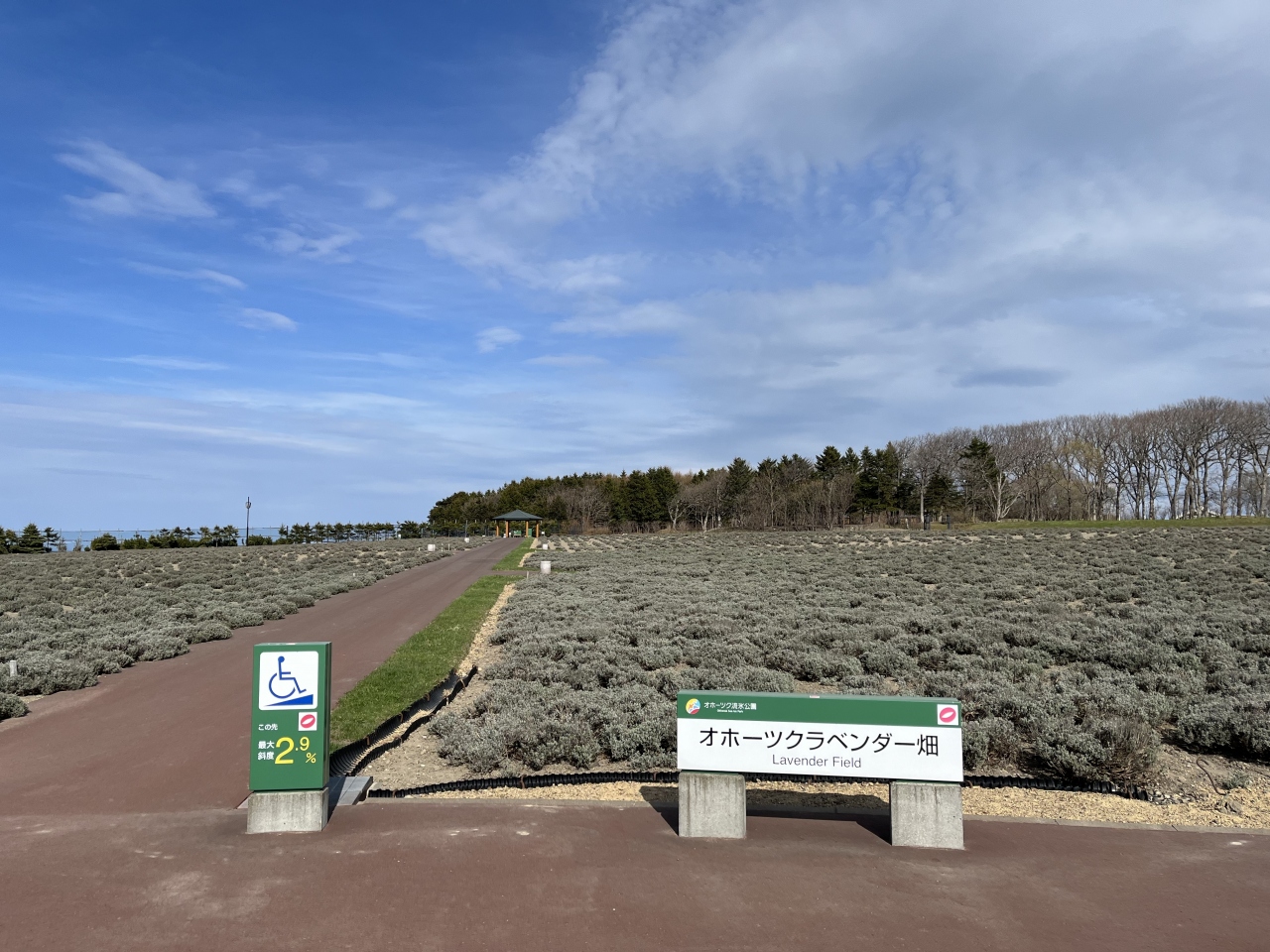 オホーツク紋別空港の近くにある公園です。海岸沿い広がる横に長い公園で、いくつかのブロックに分かれています。パークゴルフやバーベキューなど、地元の人向けの施設もありました。観光客に特にお勧めなのは、西端にあるラベンダー畑です。一面にラベンダー畑が広がっています。5月だったのでラベンダーは咲いていませんでしたが、天気も良くて、一面のラベンダー畑は壮観な眺めでした。なお、ラベンダーの見頃は7月だそうです。