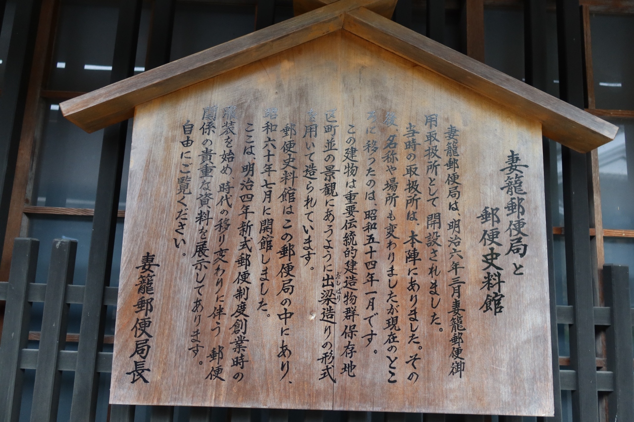 旧中山道の妻籠宿にある妻籠宿観光案内所の左隣に妻籠郵便局があります。この郵便局の中には郵便史料館が併設されており、見学しようと立ち寄ったのですが、ここが現役の郵便局であることを忘れていました。日曜であったため当然閉局。訪れる際には営業日に注意が必要です。