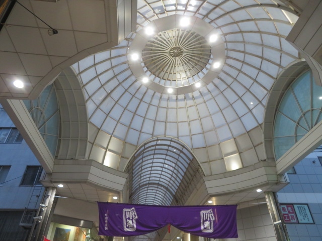 櫛田神社のそばにあり、神社の参道的存在の商店街です。光がよく入るようなアーケードになっていて、ドームになっている所もあり、明るい雰囲気です。「はかたの心に出逢う街」と書かれた旗も上から飾られていて、gotoトラベルが終わってすぐでしたが、閉まっている店も少なく賑わっていました。
