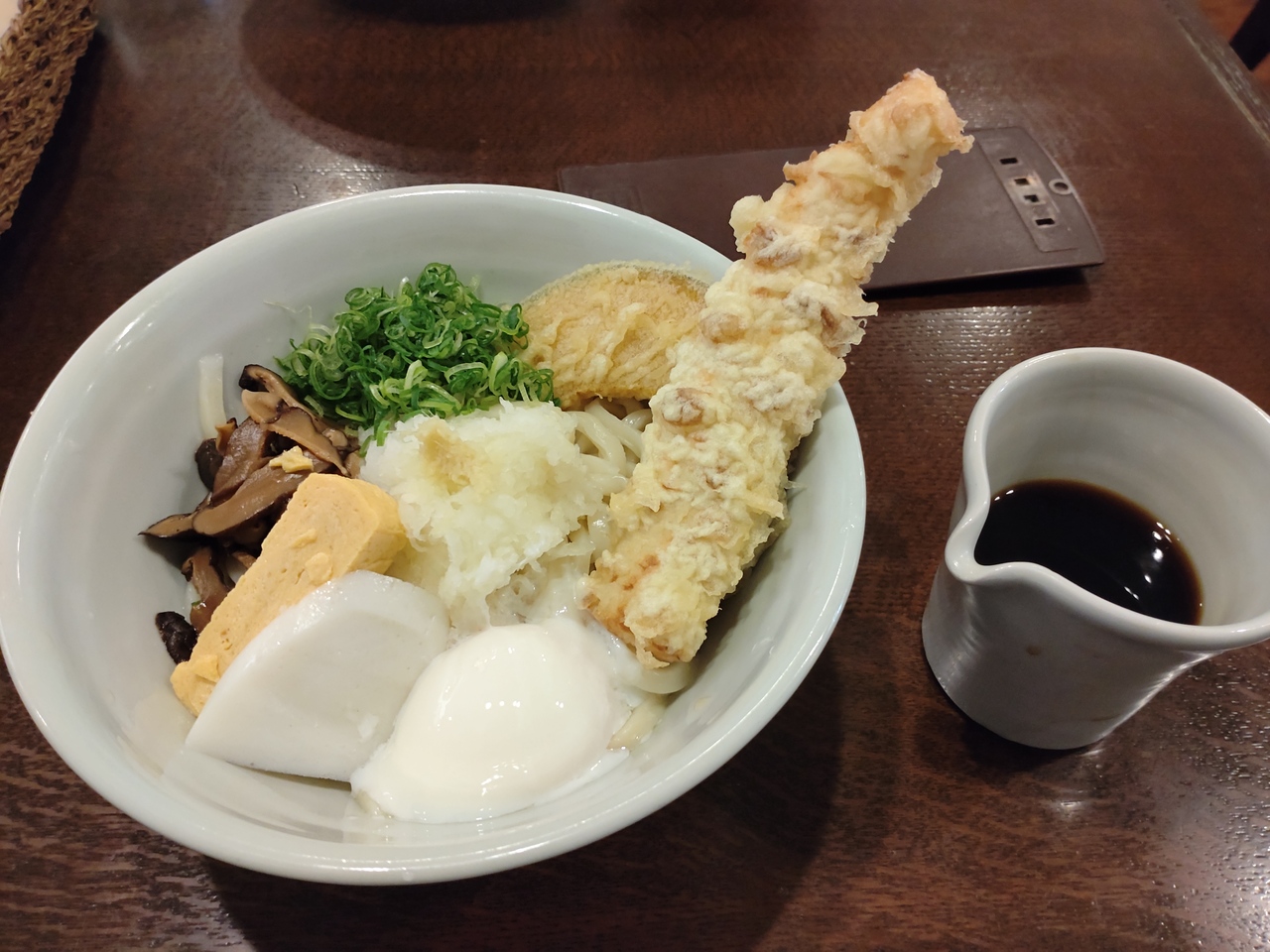 少し高めの設定ですが、メニュー数が豊富で、創作うどんも多い。うどんは二ツ玉まで無料という嬉しいサービスで、ついつい食べ過ぎてしまう。今回は、中でも人気の「田舎」をオーダー。店内で打ったうどんに、だし巻き玉子、蒲鉾、雑椎茸、揚げてのちくわ天とかぼちゃ天、さらに大根おろしで、これをぶっかけでいただくもの。麺は少しコシの強い中太麺で食べごたえがあり満足感もある。汁は出汁のきいた少し甘めの味。これがうまく全体をまとめている。二つ玉でもペロッといただけます。