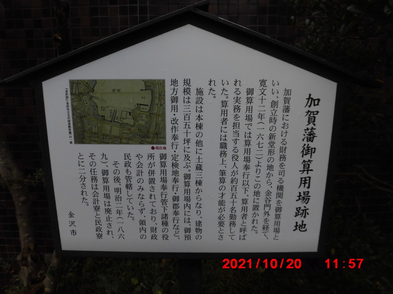 金沢市観光で立ち寄りました。加賀藩御算用場跡地の説明板は、尾崎神社の駐車場を出てすぐ近くのビルの前に立っていました。加賀藩御算用場は、敷地面積は350坪、役人が150名、本棟及び土蔵3棟からなるかなりの組織だったようです。加賀藩の財務部門みたいな組織です。