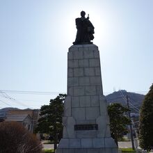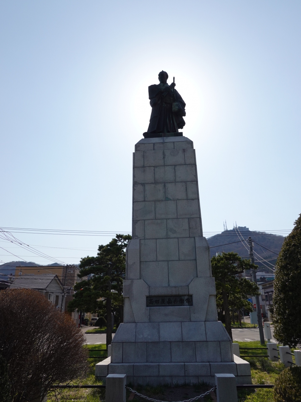 高田屋嘉兵衛は、江戸時代に活躍し、函館の繁栄を築いた豪商です。その像が護国神社に至る県道675号線の中央分離帯の緑地に建っています。台座がとても大きく見栄えのする素晴らしい像です。私たちが訪れたのが晴れた日の午後2時半頃で、正面から見ると逆光になってしまったのが残念でした。