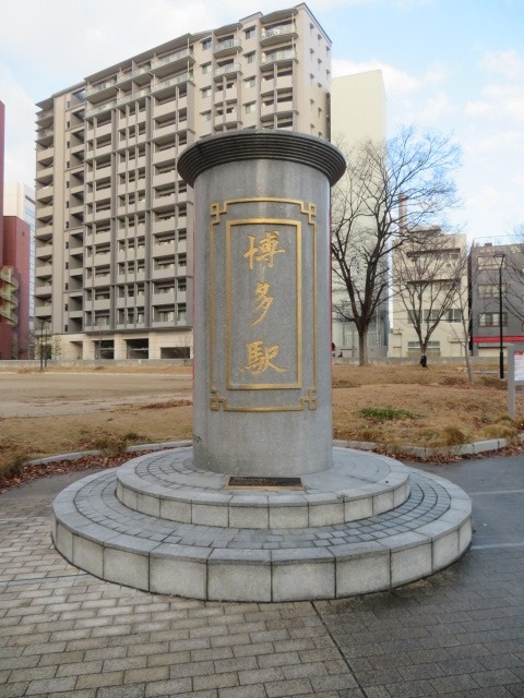 博多駅から近い公園です。何もない公園のようですが、旧博多駅があった場所です。その証拠として、「博多駅」と書かれた円柱の碑が立っています。ということで、九州鉄道発祥の地の黒い石碑もあります。つまり、こちらの出来町公園から九州の鉄道が発展していったということですね。