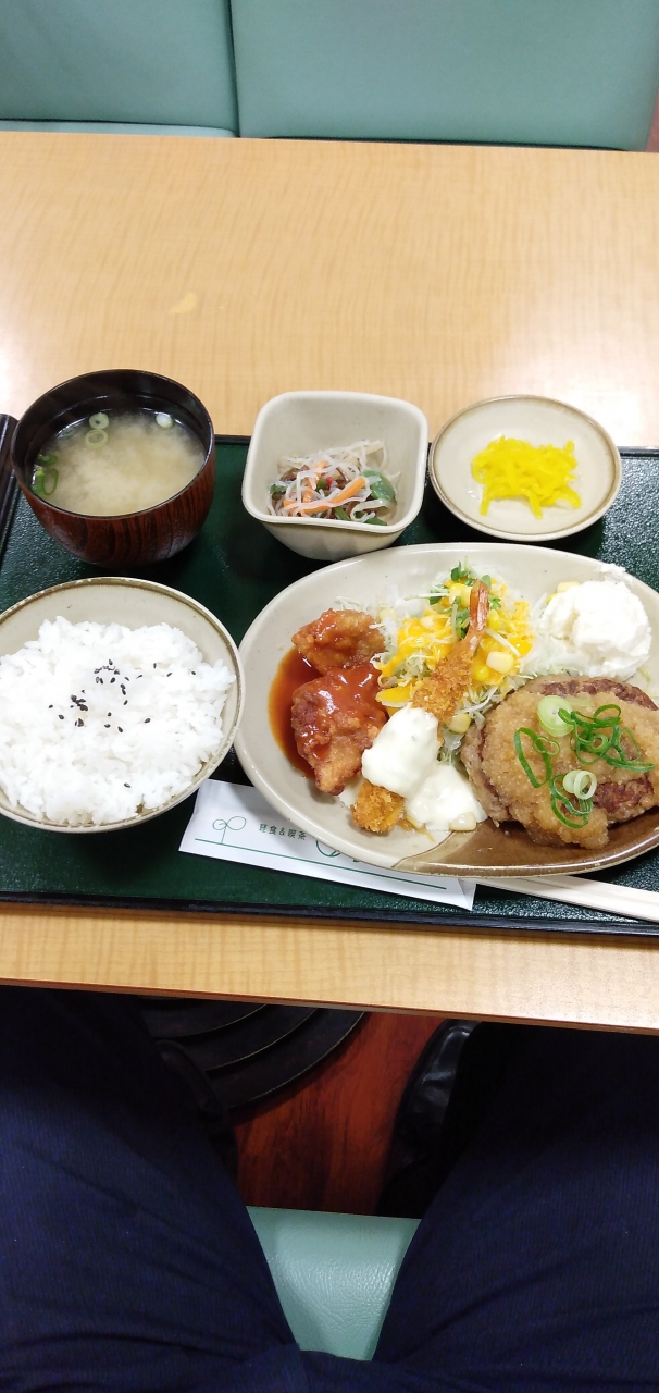 店頭にサンプル、絶妙に省スペースな席配置。うどん・そば・定食に洋食まで揃い、注文タブレットどころか呼び出しベルも無いと言う、ザ・昭和な喫茶店♪店名冠した”オアシス定食”は、おろしハンバーグ・エビフライに唐揚げと言う、みんな大好き欲張り定食♡