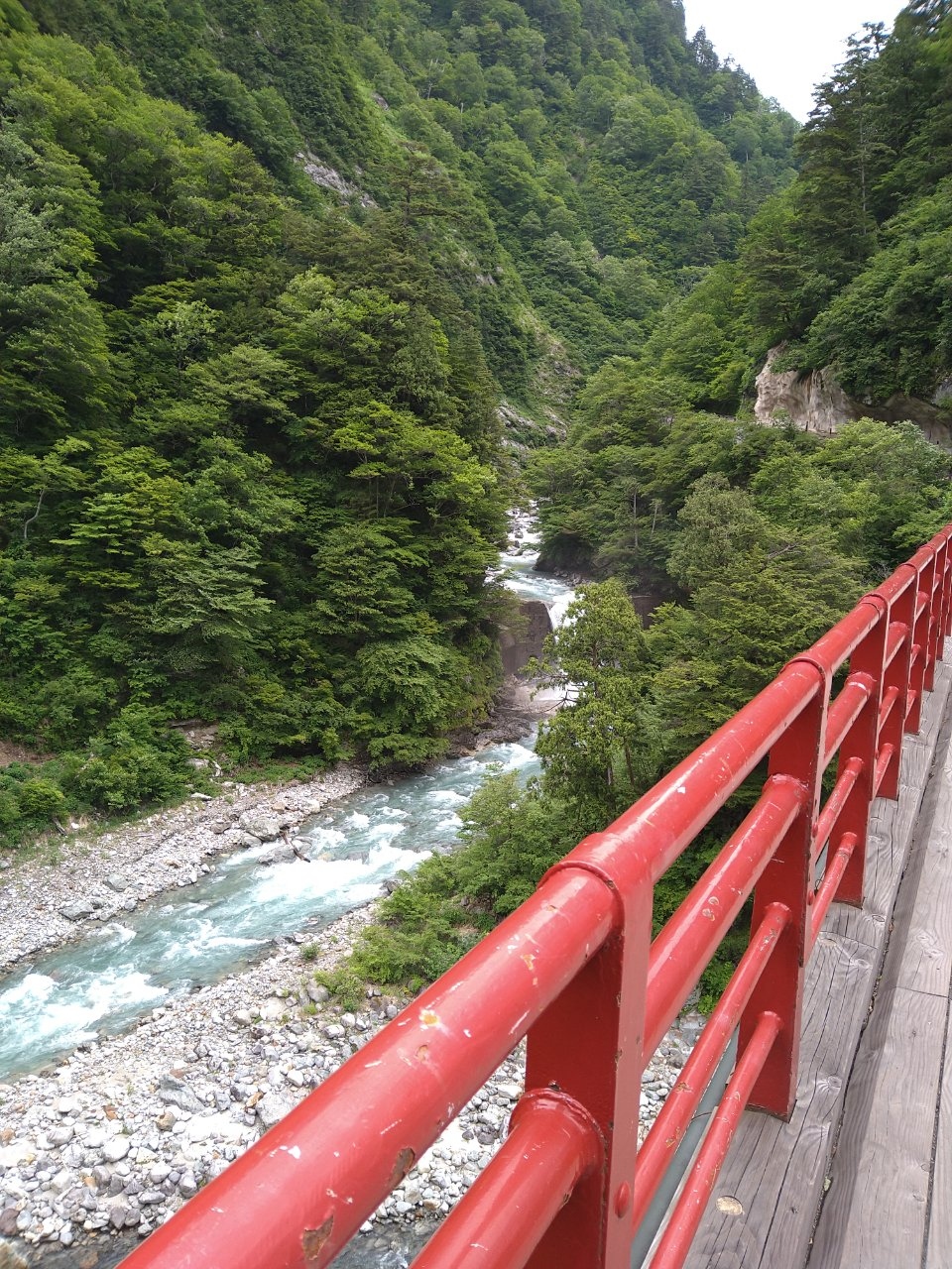 欅平の風景写真でこの赤い橋をよく見ていたので、必ず行ってみたいと思っていた場所でした。ただ行ってみたら、散策気分にもまだならないうちに駅を出てすぐ着いてしまい、山の中の吊り橋のようなイメージを抱いていたので、しっかりとした頑丈な赤い手すりの鉄パイプに少々がっかり。ただここから見上げる渓谷の景色は、川の流れの音とともに強く記憶に残る素晴らしいものでした。