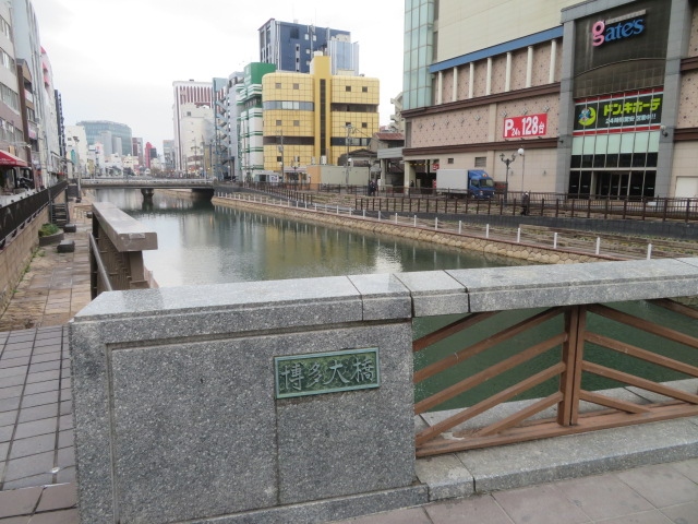 地下鉄の中洲川端駅のすぐ近くの博多川に架かる橋です。大橋ということで、車がバンバン通る橋のイメージですが、小さい橋です。近くにある博多橋よりは大きいということです。こちらの橋の上から眺める景色は、大阪の橋の上から道頓堀川を見る景色によく似ています。