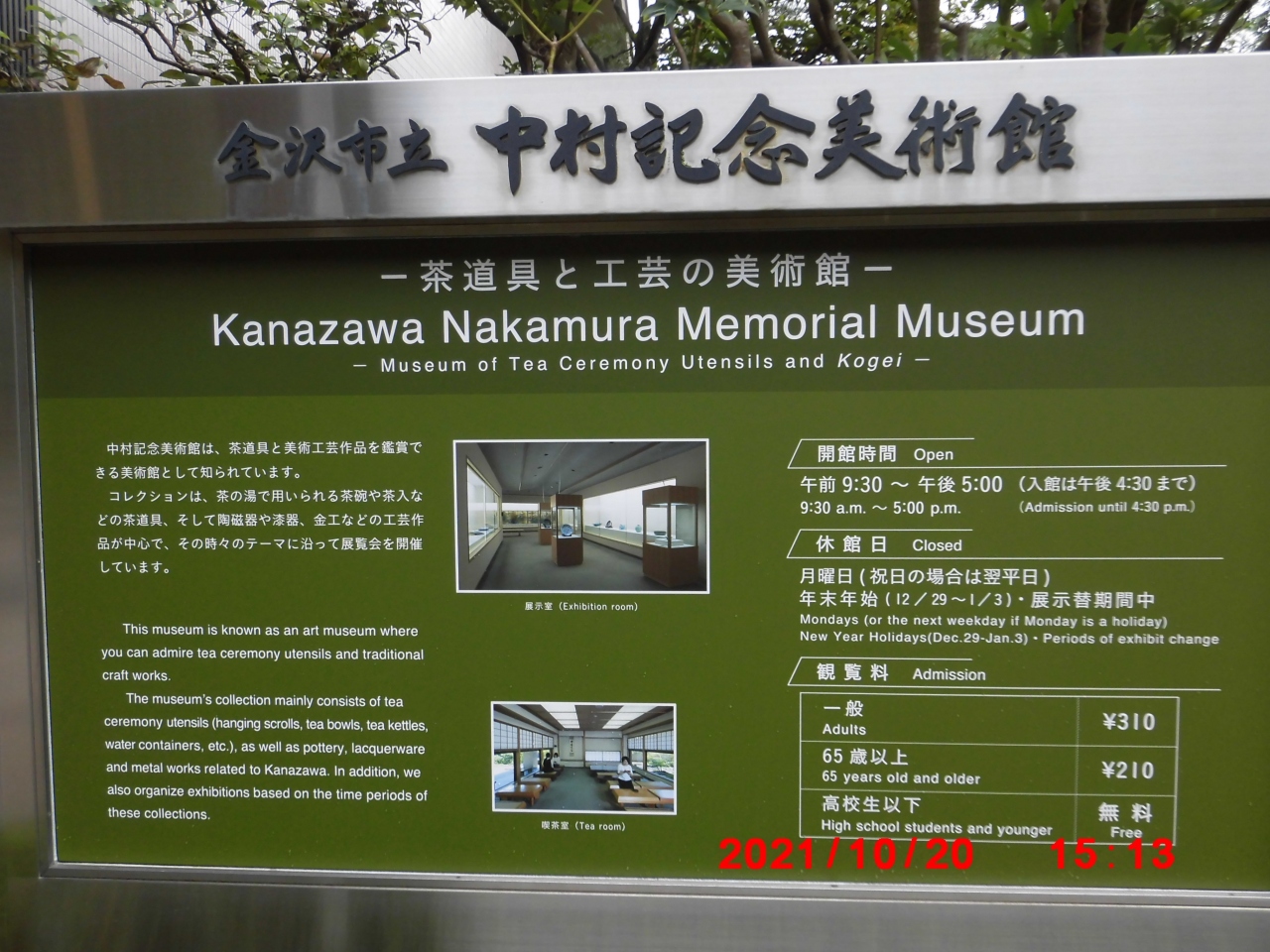 金沢市観光で立ち寄りました。金沢市立中村記念美術館は、本多通り沿いにある石川県立図書館の東隣にありました。展示内容は、茶道具と美術工芸品で、茶の湯で使用する茶碗や茶入れなどの茶道具、陶磁器や漆器、金工品がメインの展示物です。料金も私の年代だと210円なので、雰囲気を楽しむだけでも価値があると思いました。