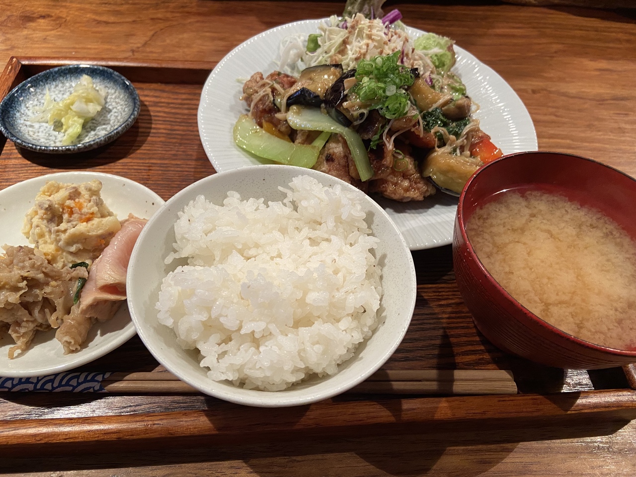 谷町7丁目にある、酒楽屋おがわさんです。居酒屋さんですが、お昼のランチ営業もされているので行ってきました。4種類の定食があり、油淋鶏を注文しました。小鉢、ご飯、お漬物、メインはパリパリの鳥に茄子や、パプリカなど沢山のお野菜の餡がかかっていてものすごく美味しかったです。