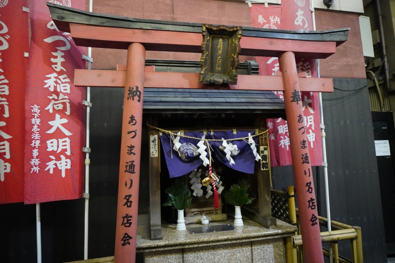 あづま稲荷神社は、あづま通りと三原通りを結ぶ路地の途中。この路地が敷石の路地で、けっこう粋な雰囲気なんですよね。神社は、火災を鎮めるために京都伏見稲荷神社から分祀して建てられた神社ということ。近くには飲食店があったりするし、ちょうどいいと思います。