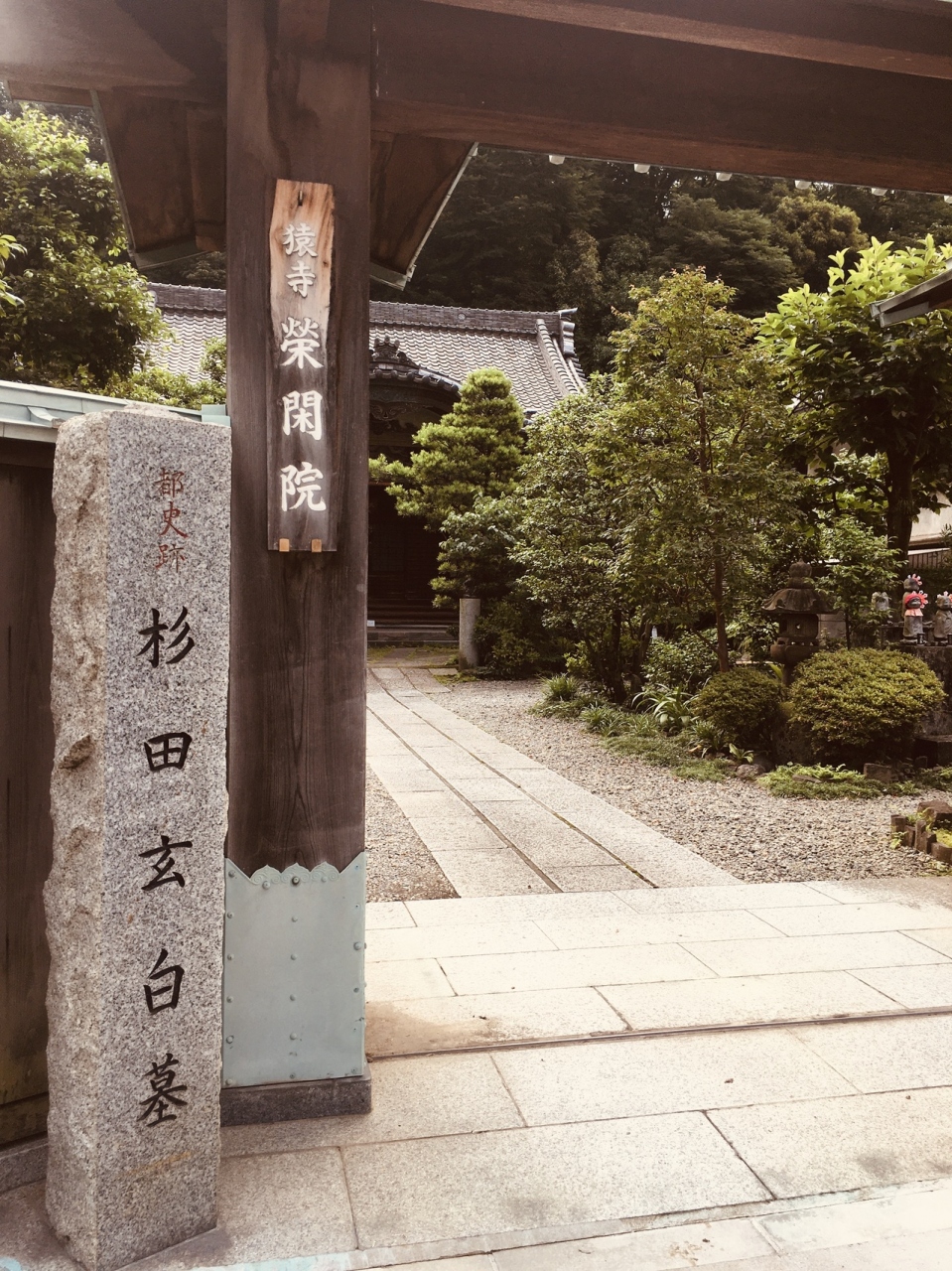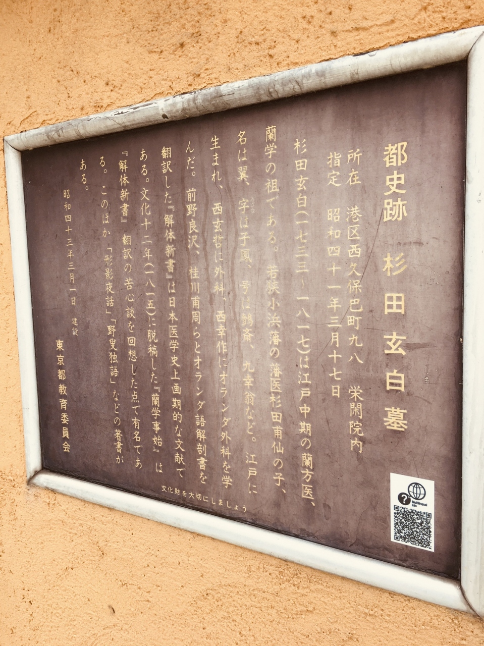 栄閑院の境内にあり、本堂の裏手がお墓になっています。解体新書の翻訳等をし、歴史の教科書にも登場する蘭学の祖と言われる人です。寺の門前に杉田玄白の墓と記載してある石碑があり、生い立ちを書いた説明看板もありました。