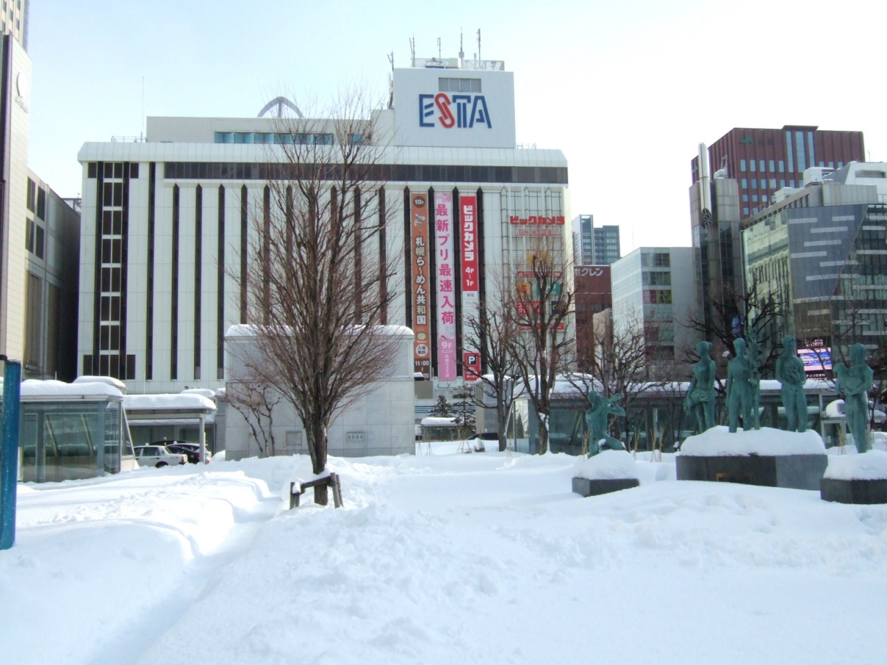 札幌駅の大通側にある南口を出ると、右の西側には大丸、左の東側にはエスタがあります。