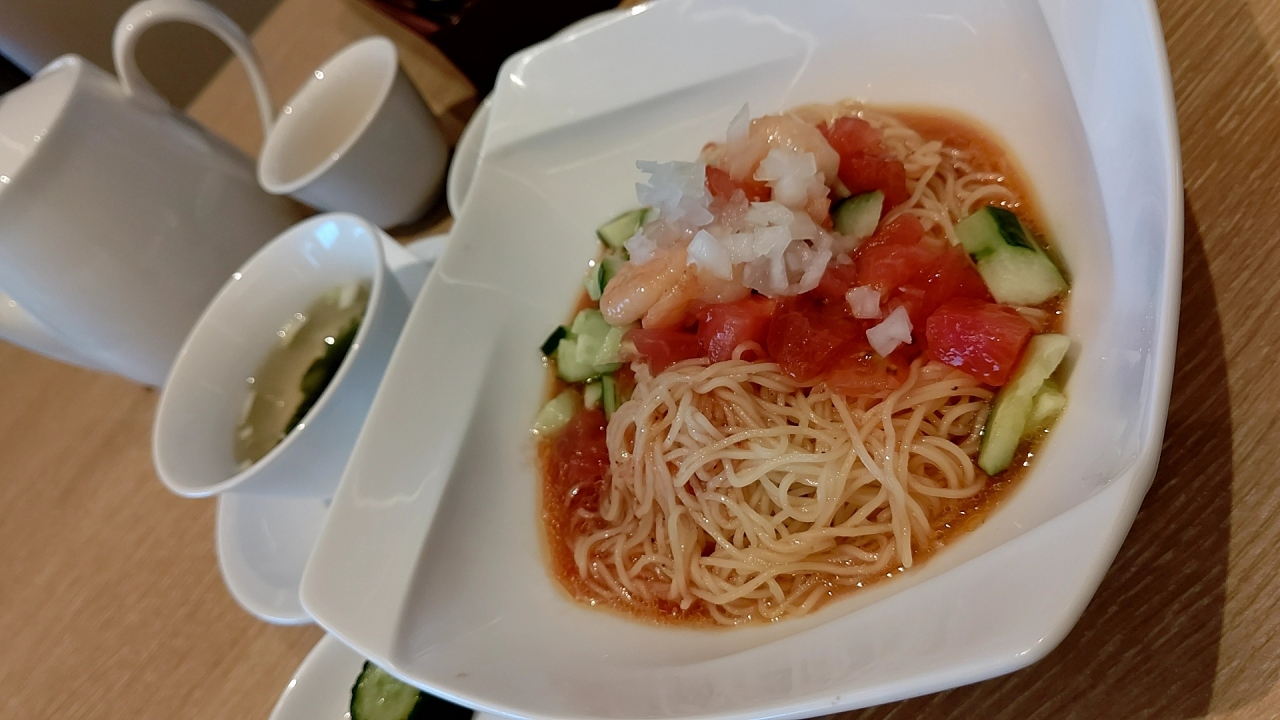 注文は、期間限定のランチセットでトマトと海老の冷風麺と小籠包4個を小籠包6個に変更と海老餃子を注文。