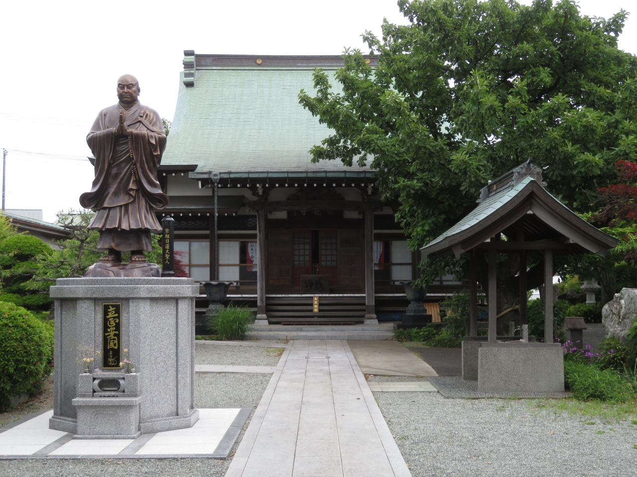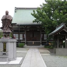 立派な桜の木が植わる参道を進んだ先にある境内には、立派な本堂とこれまた立派な日蓮上人の銅像が鎮座しています。境内はきれいに清められ、すがすがしさを覚えます。