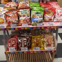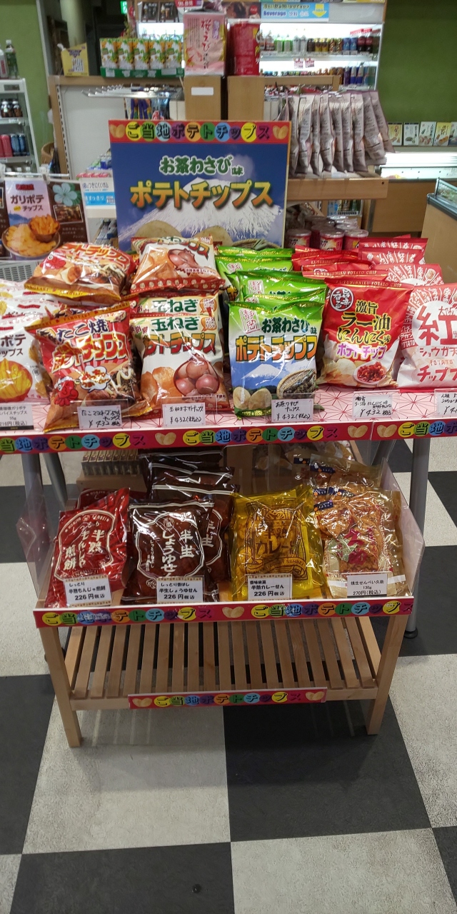 おみやげ屋さんのポテチコーナーにはご当地ポテチがならび、ふつうのスーパーでは見かけられない珍しいフレーバーが豊富にあり、思わず購入してしまいました!陳列方法がなかなかよいです。思わず欲しくなります。