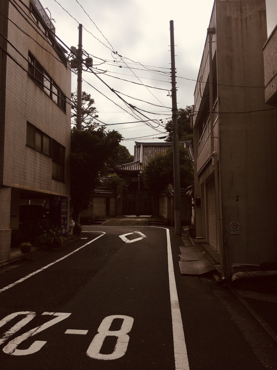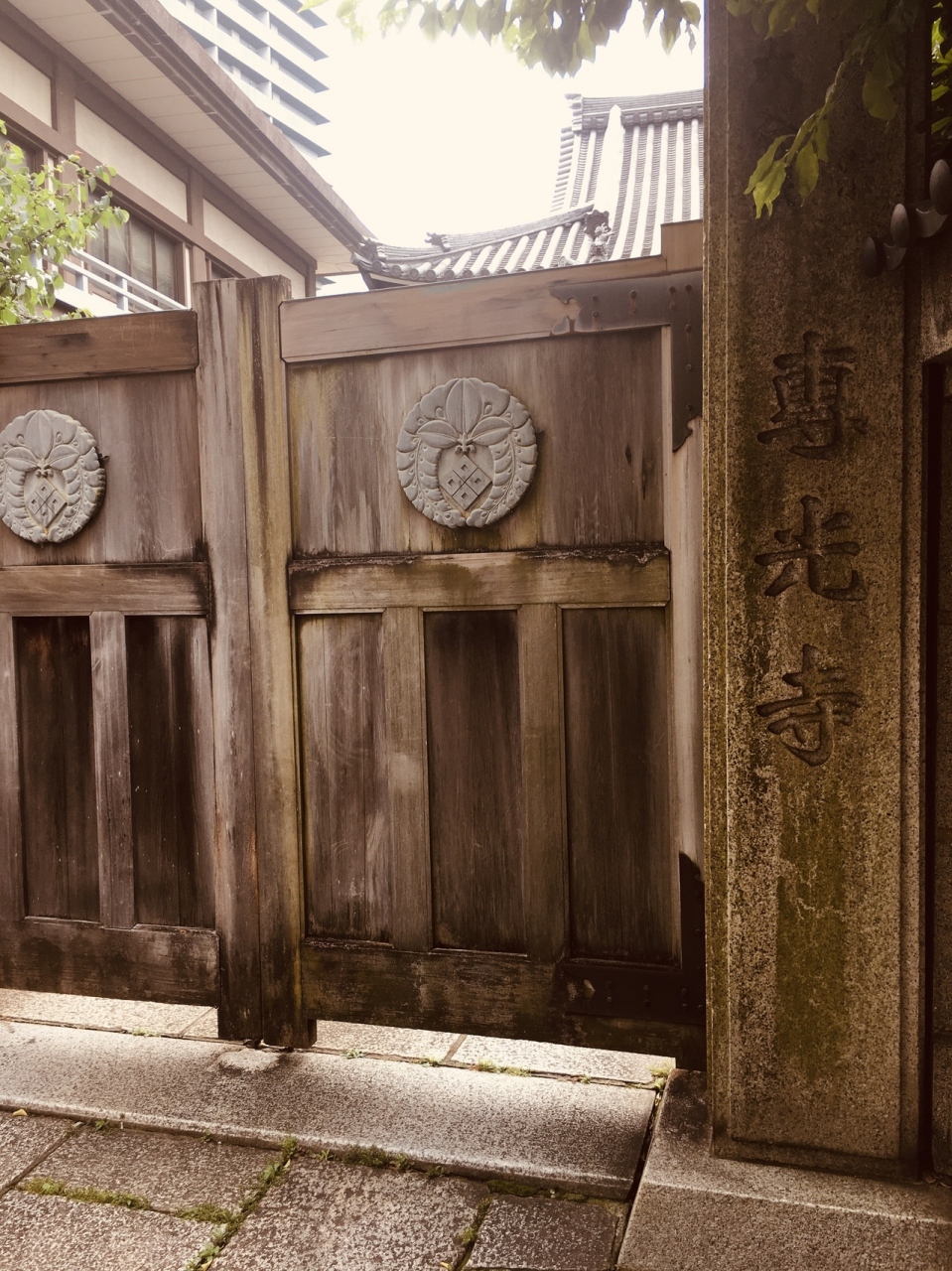 裏道の門にあるお寺です。本堂の横には2階建ての建物があり自宅も兼ねているような雰囲気でした。観光寺院ではないので人もおらず都会にありながら静かな光景でした。門の扉には家紋のようなものが2つあり、目立っていました。