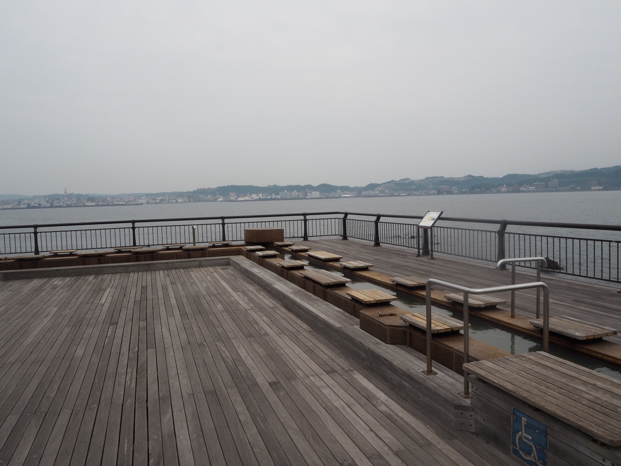 桜島溶岩なぎさ公園は櫻島フェリーターミナルから歩いて数分、桜島ビジターセンタからすぐの場所にあります。海岸沿いに広がっている公園で、ここには100メートルほどに及ぶという長い足湯もあります。訪れた時は数人の人が足湯を楽しんでいました。またここからは溶岩の中を歩いて行ける、なぎさ公園遊歩道も始まります。