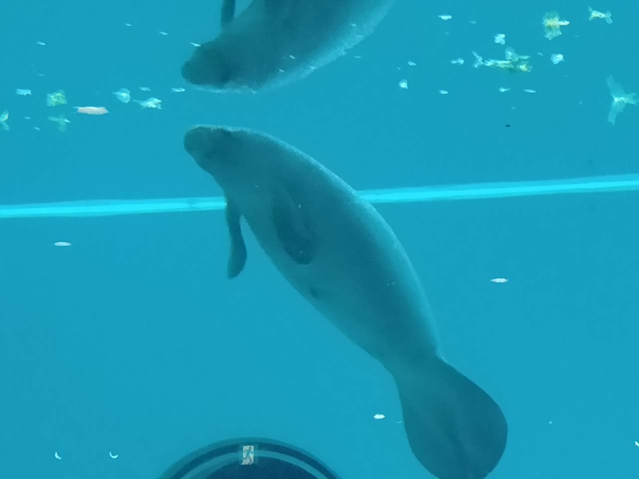 メキシコ生まれの親子マナティー?が、ゆっくりのんびりと水槽内を泳いでキャベツを食べていました。
