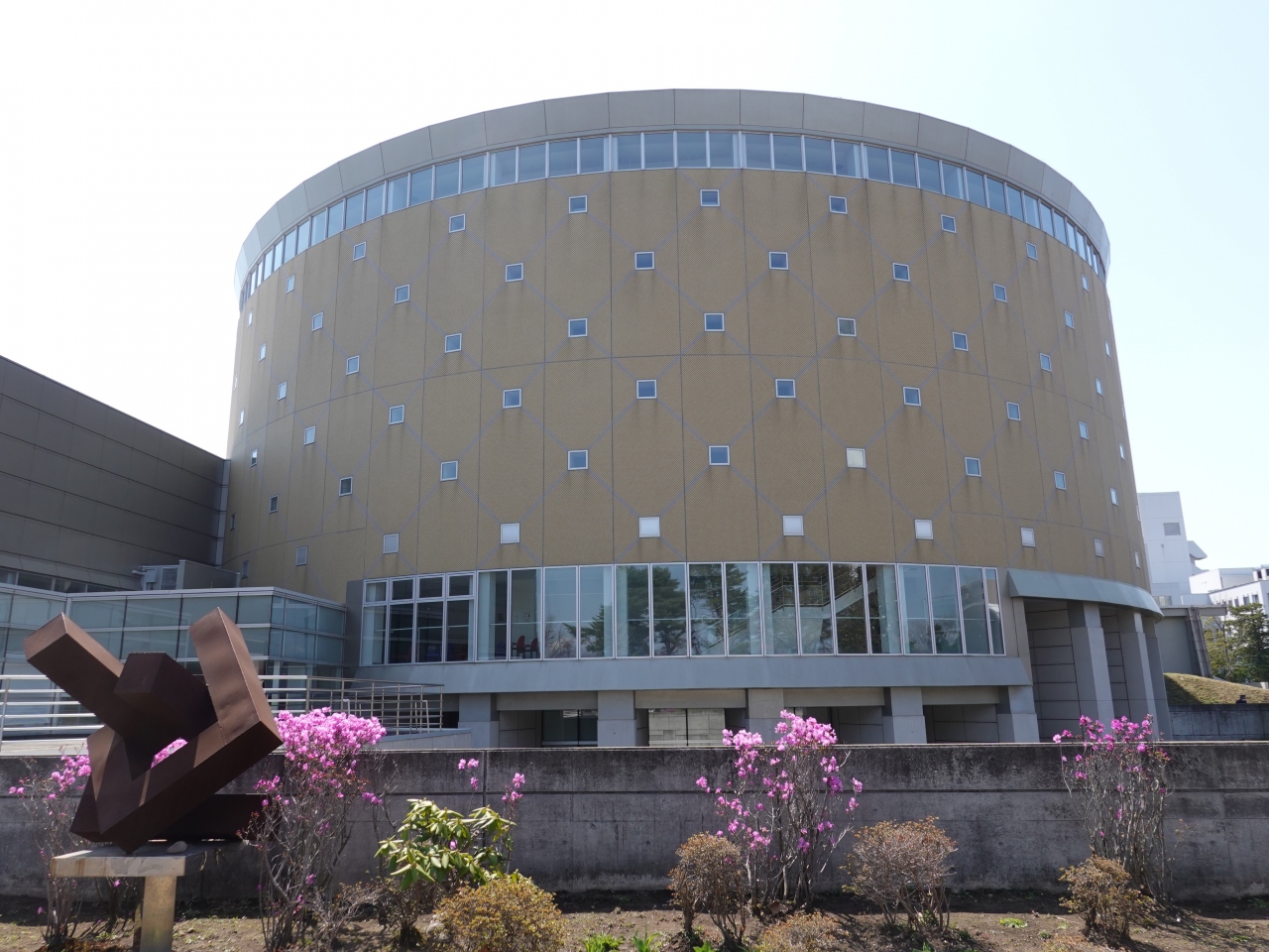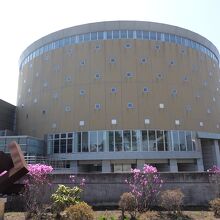 函館市芸術ホールは、五稜郭のすぐ南に位置する施設で、1998年に開業した多目的ホールです。入口は「函館市北洋資料館」と一緒になっており、私たちは北洋資料館目的で訪問した際に立ち寄りました。この日は興行は行われておらず、ロビーと外観のみの見学でしたが、巨大な円筒形の外観は圧巻でした。