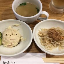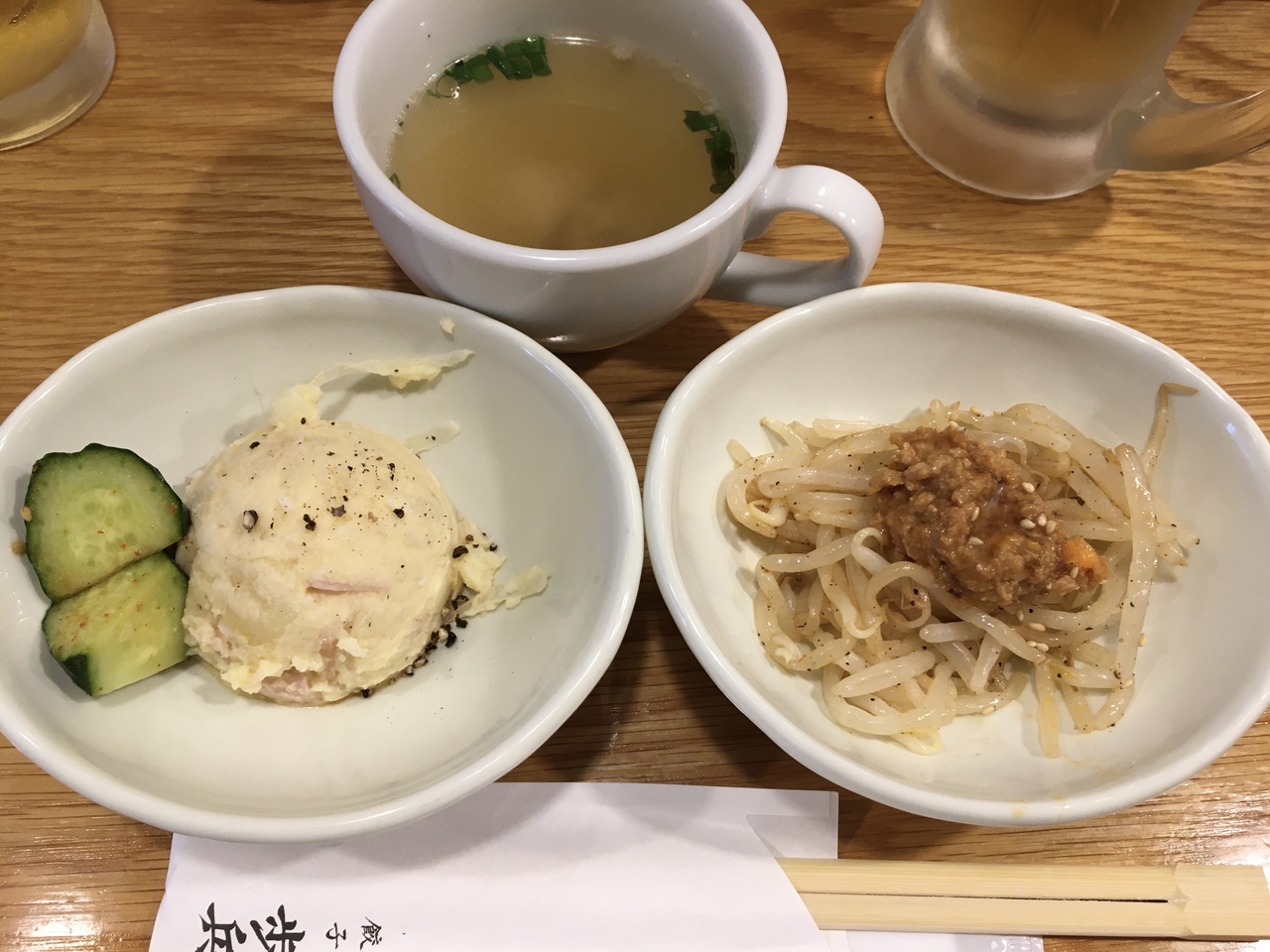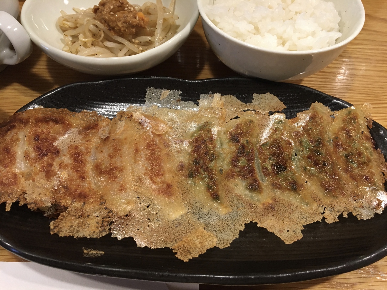 新橋駅から歩いて5分くらいの場所にお店があります。土曜日、開店の12時に来店。並ばずに座れましたが、その後すぐに満席になりました。ランチセット(1200円)には、餃子の他にポテトサラダや肉味噌もやしなどの小鉢が付いてきて嬉しいセットです。餃子は小さめで食べやすかったです。