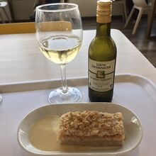 平日の昼間、休憩がてらにレストランへ。食事をするほど空腹ではないが何か食べたい、ということでアップルケーキをいただく。表面にはクランブル、横にはカスタードクリームが添えられている。甘さはそれほど強くないのでわりとおすすめ。白ワインにもよく合う。